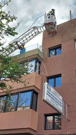 Vecinos han alertado del desplome del enfoscado de la fachada superior de un inmueble de la Avenida de la Constitución, a la altura de los 28 y 30 de esta céntrica y transitada vía peatonal de la ciudad. Bomberos de dos unidades del parque de La Garita han saneado el frontis y acotado el espacio donde han caído los cascotes. También ha hecho acto la Policía Local y Protección Civil.
