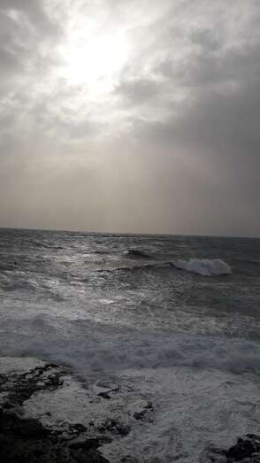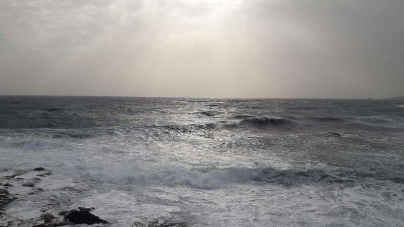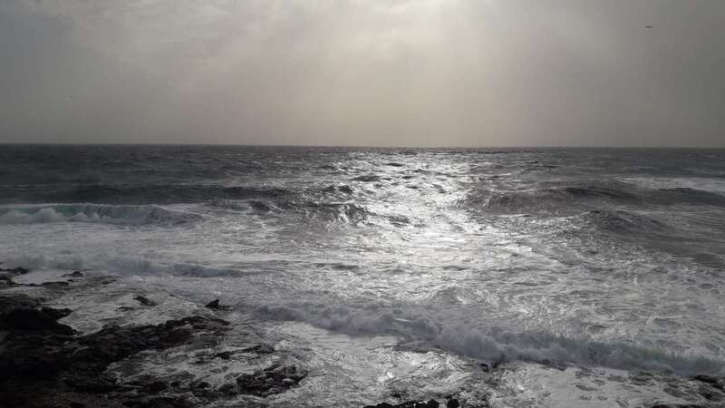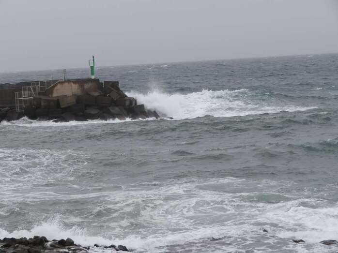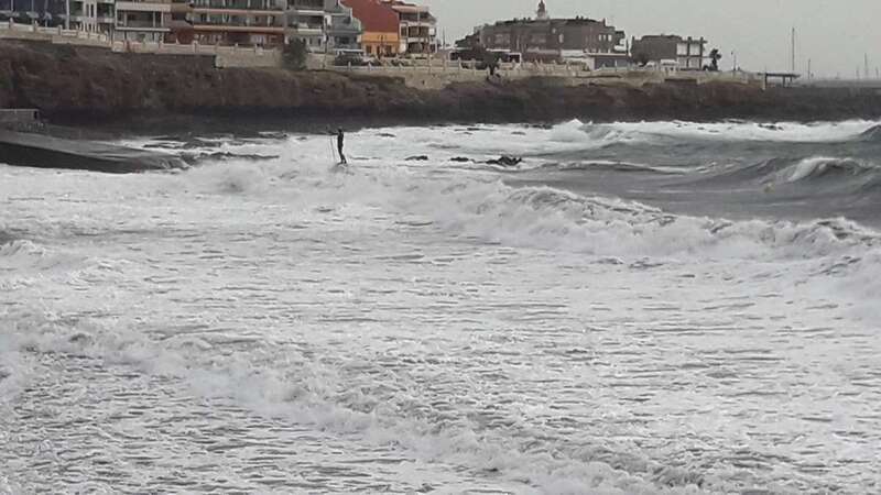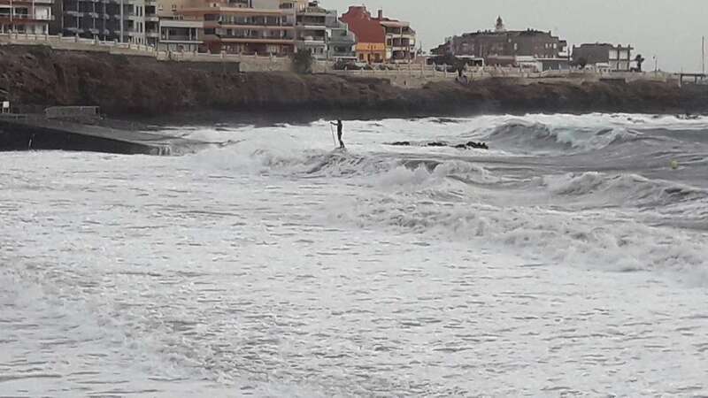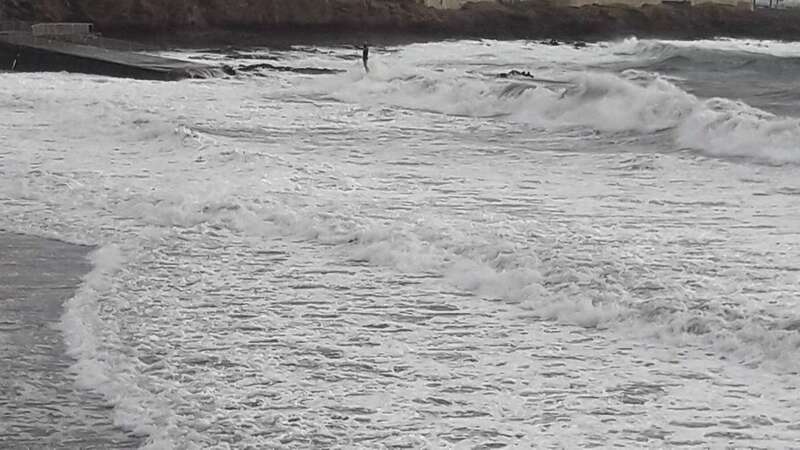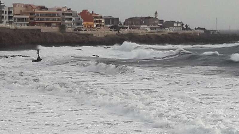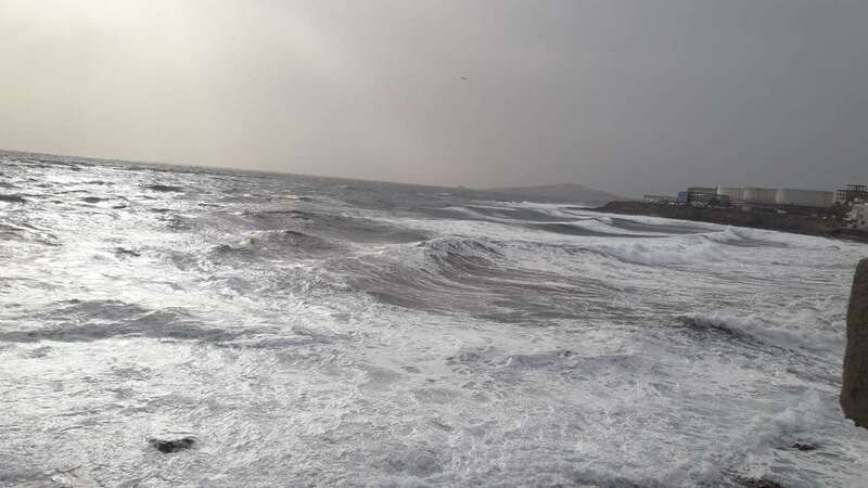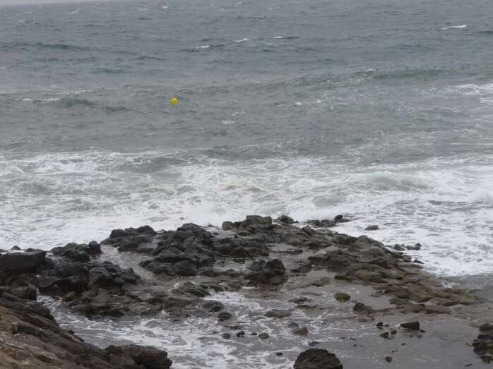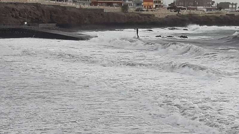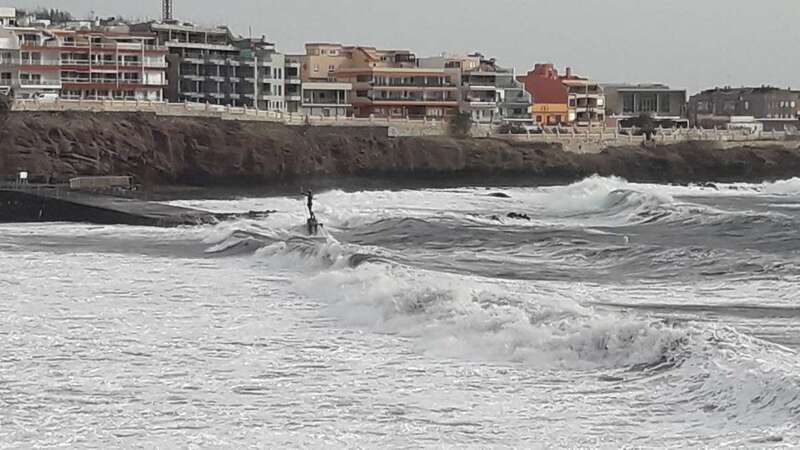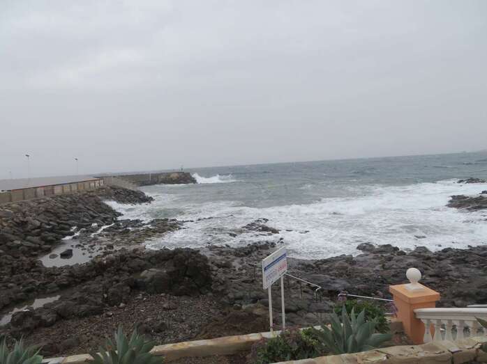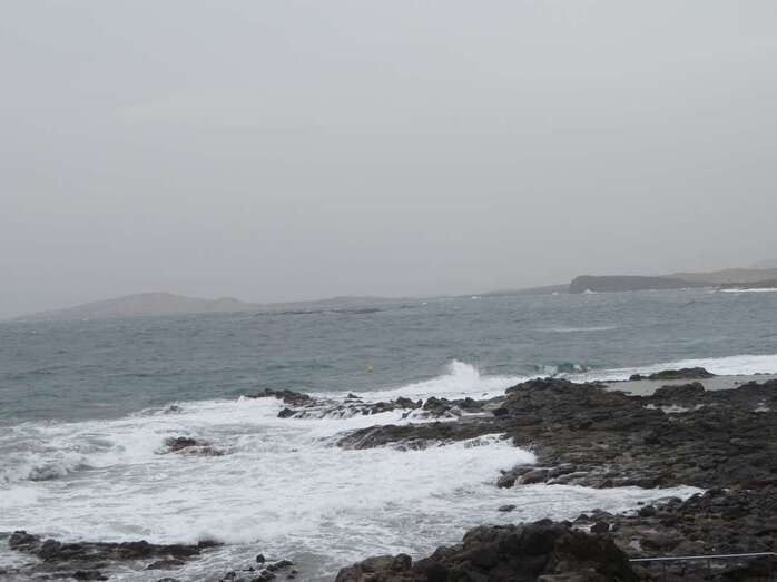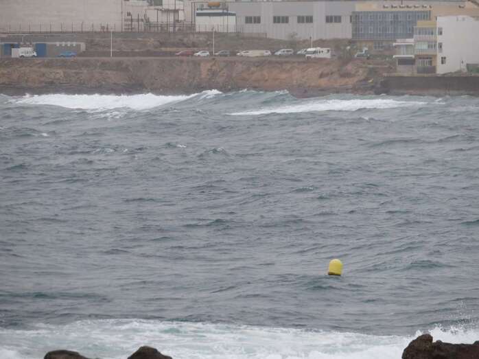 A la calima y el fuerte viento se ha sumado en esta jornada un mar enfurecido con olas de varios metros que golpean con fuerza la costa de Telde, en un cóctel de fenómenos meteorológicos y marinos adversos.