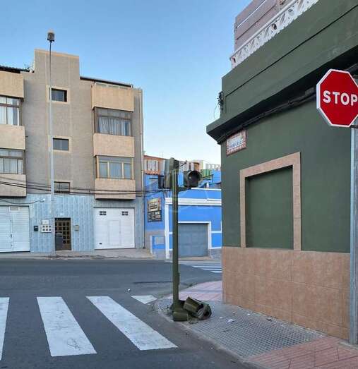 Un camión o un vehículo de gran volumen causó daños esta mañana al poste de semáforo que regula en la calle de Torricelli el tráfico que sale del barrio de Casas Nuevas hacia la carretera general de Melenara (San Fernando).