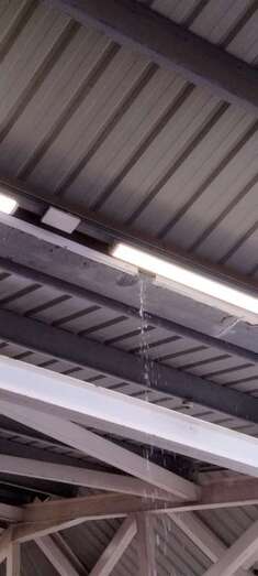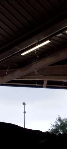 Nuevas filtraciones de agua en el área polivalente de Narea que sirve temporalmente como Mercado Municipal. El recinto ya se sometió recientemente a unas obras para subsanar estas goteras, pero visto lo visto en la jornada de este lunes, el agua ha vuelto a abrirse paso bajo la cubierta.