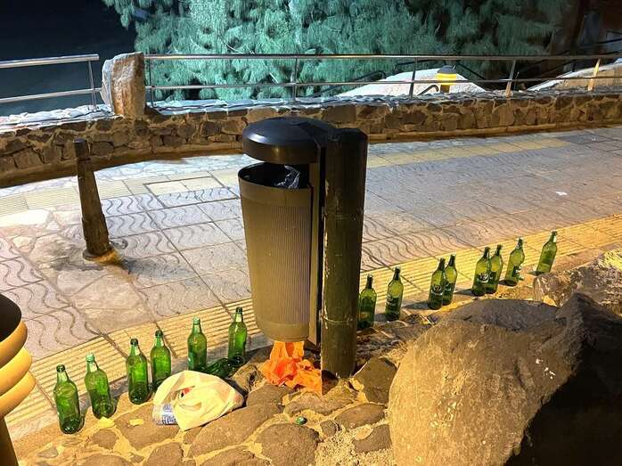 Vecinos de la playa de La Garita denuncian el incivismo de un grupo de personas que días atrás realizaron un botellón en pleno paseo marítimo y dejaron tiradas botellas de cristal de cervezas y otros recipientes y basuras pese a tener una papelera justo al lado.