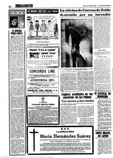 La noticia, ilustrada con imágenes del fotógrafo Rodríguez Valido, comparte portada al día siguiente en el Eco de Canarias con noticias como el descarrilamiento mortal de un tren en Portugal, una revuelta popular en Zambia, la reanudación de las relaciones comerciales entre España y Japón, el VI Festival Español de la Canción de Benidorm, un concurso infantil de castillo de arena en las Alcaravaneras y hasta con el anuncio de un icónico transistor de la marca Panasonic.