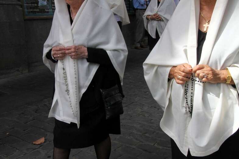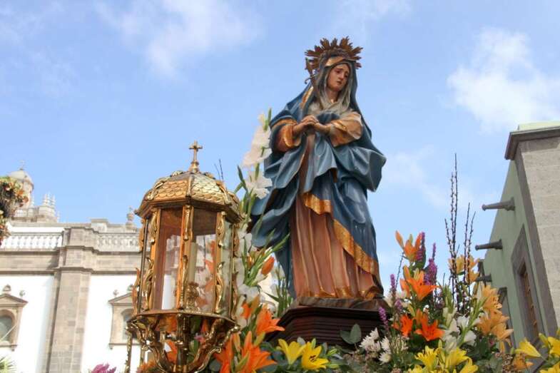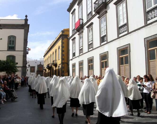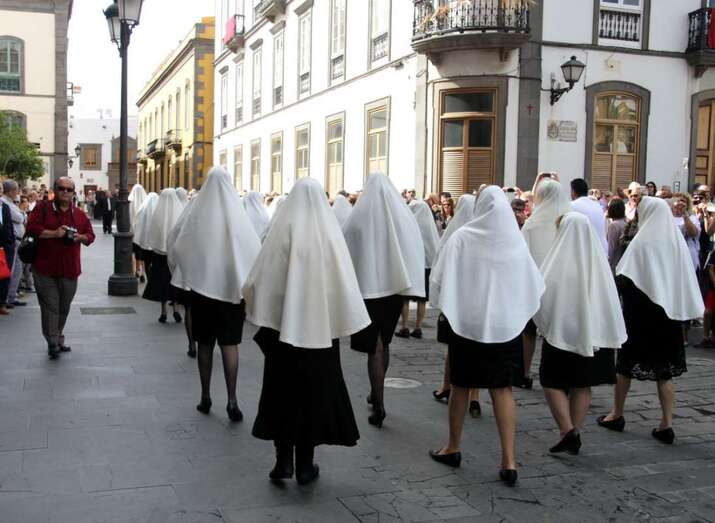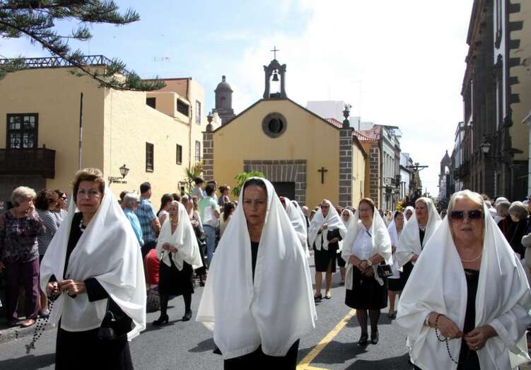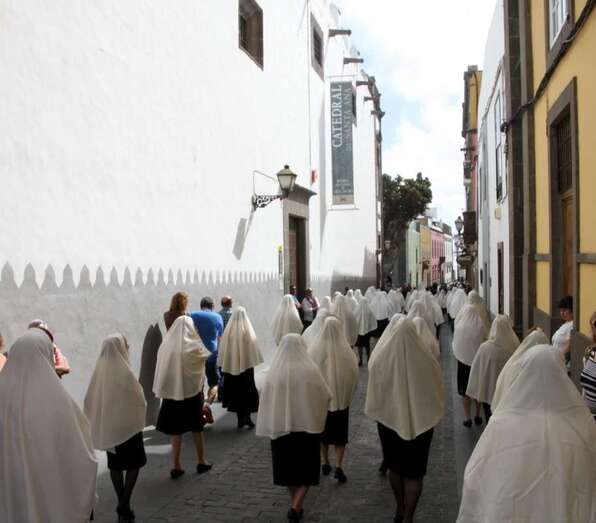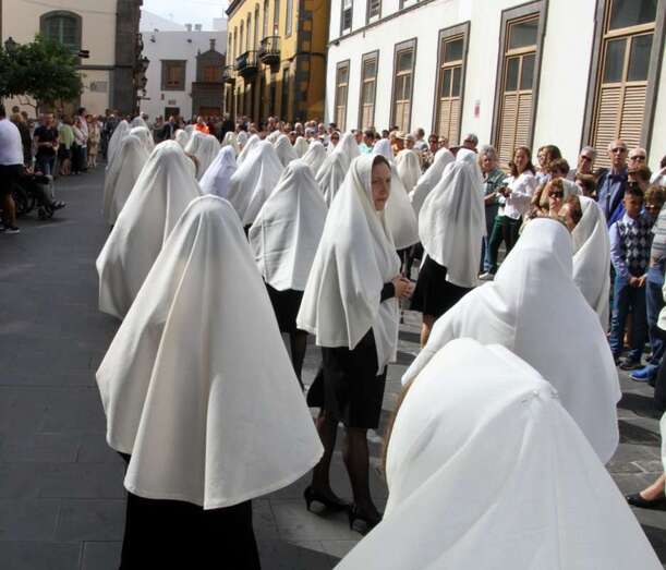 Un numeroso grupo de mujeres avanza frente al público de la que ya es conocida como la Procesión de las Mantillas, convertida en tradición desde hace años, un momento para el que las mujeres han guardado con esmero esta prenda del antiguo vestir de la Isla que ha quedado marcada por la tradición religiosa, informa la consejera de Artesanía del Cabildo de Gran Canaria, Minerva Alonso.