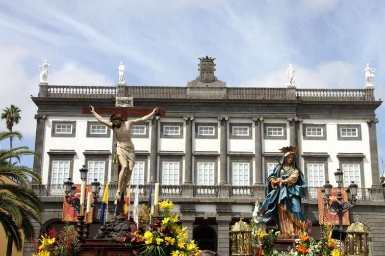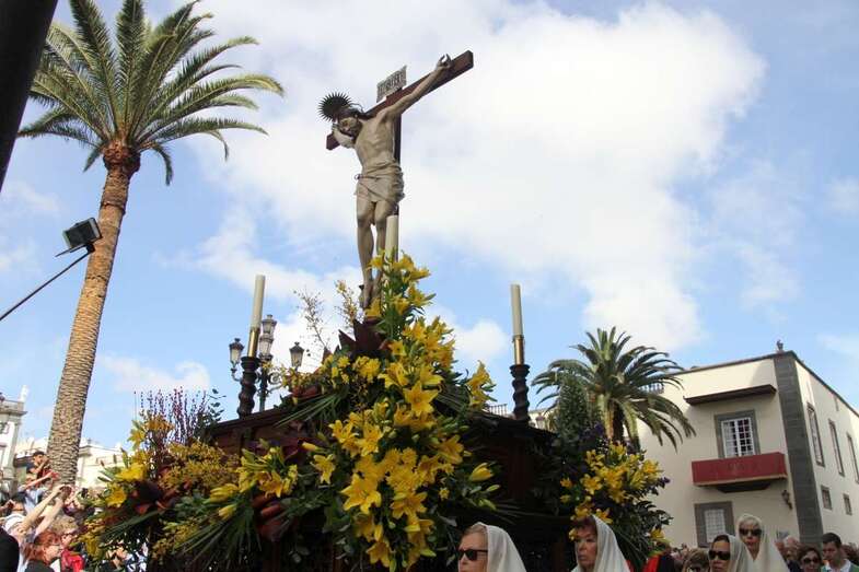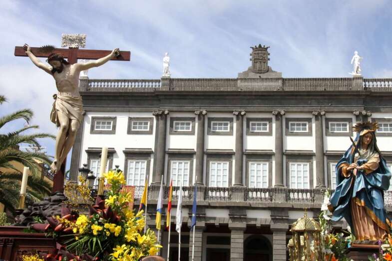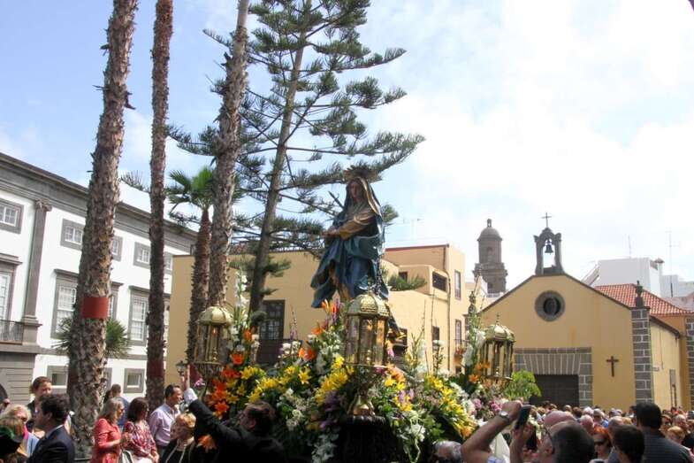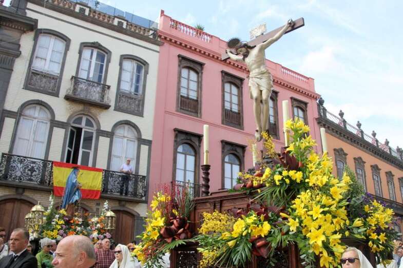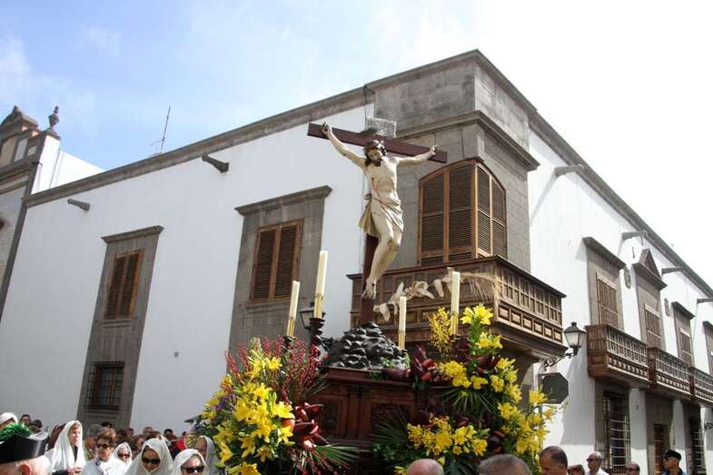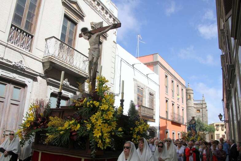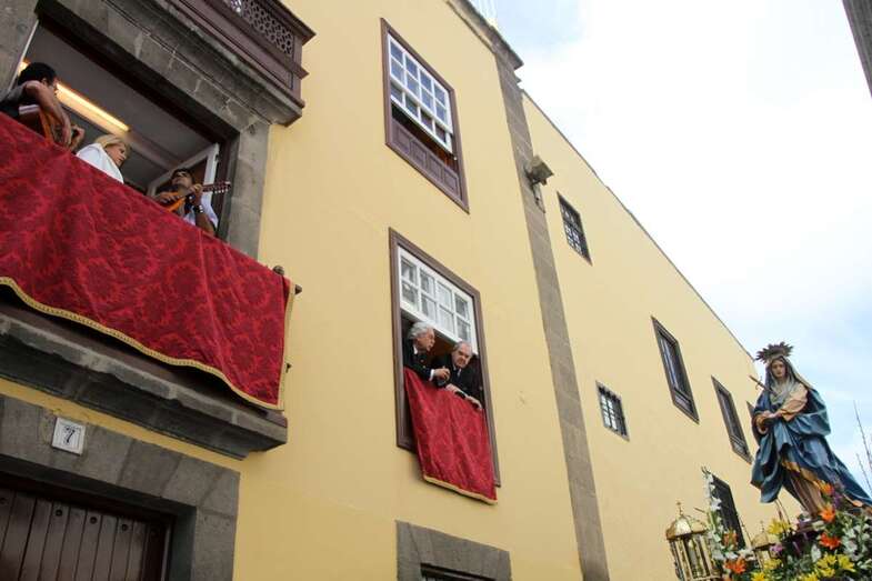 Un escenario que por su representación del patrimonio histórico artístico urbano de esta zona capitalina, no solo aúna el sentir religioso, la devoción y la veneración hacia esta imágenes, sino el entorno de la zona que tanto en la hermosa mañana luminosa de nuestra primavera canaria, un azul de cielo atlántico, luz que empapa y resalta la belleza de los balcones canarios, fachadas de señeros edificios religiosos y civiles, donde sus placas nos recuerdan la propia historiografía de este barrio y de quienes las habitaron, plazas, fuentes, que a lo largo de este plano de Vegueta, recorren las calles de Obispo Codina, Espíritu Santo,  Reyes Católicos,  Dr. Chil, retornando por Espíritu Santo, Castillo y Santa Ana.