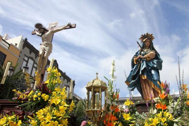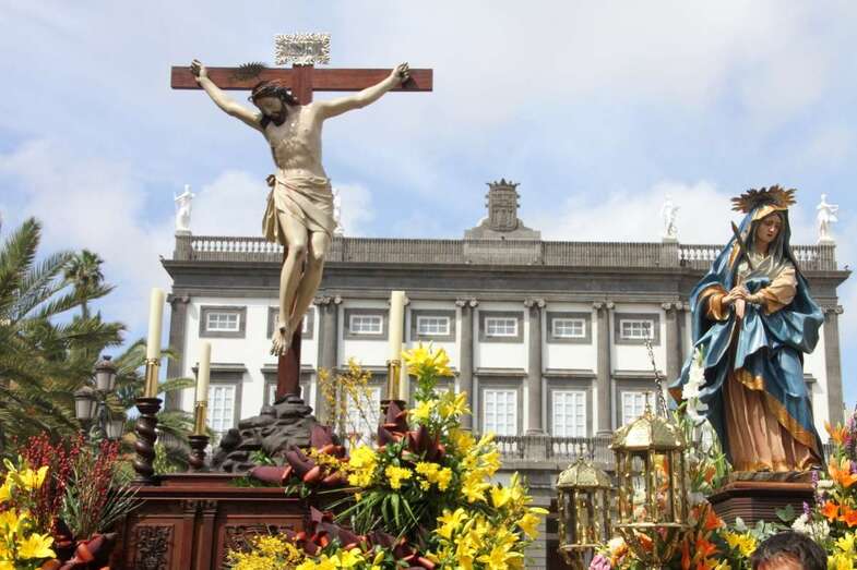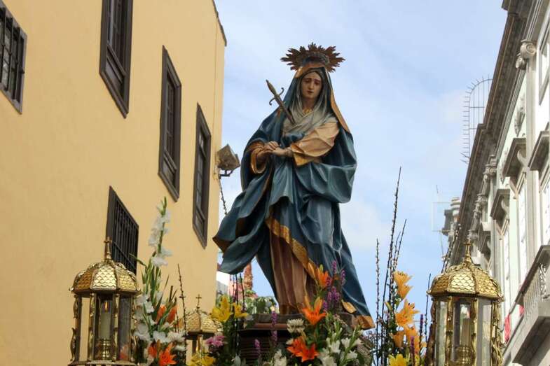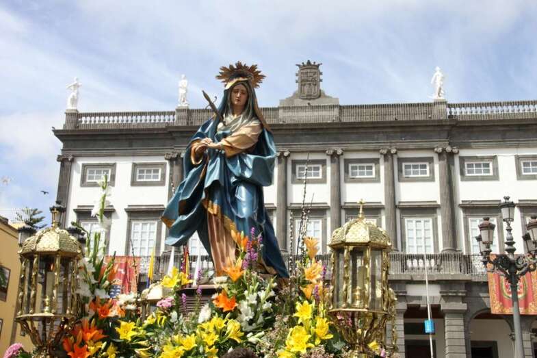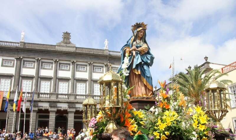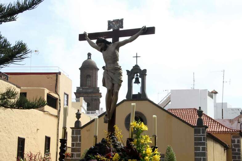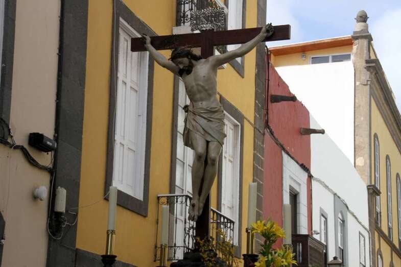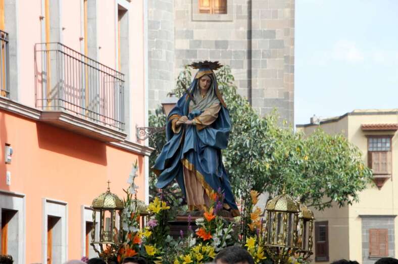 Un escenario que por su representación del patrimonio histórico artístico urbano de esta zona capitalina, no solo aúna el sentir religioso, la devoción y la veneración hacia esta imágenes, sino el entorno de la zona que tanto en la hermosa mañana luminosa de nuestra primavera canaria, un azul de cielo atlántico, luz que empapa y resalta la belleza de los balcones canarios, fachadas de señeros edificios religiosos y civiles, donde sus placas nos recuerdan la propia historiografía de este barrio y de quienes las habitaron, plazas, fuentes, que a lo largo de este plano de Vegueta, recorren las calles de Obispo Codina, Espíritu Santo,  Reyes Católicos,  Dr. Chil, retornando por Espíritu Santo, Castillo y Santa Ana.