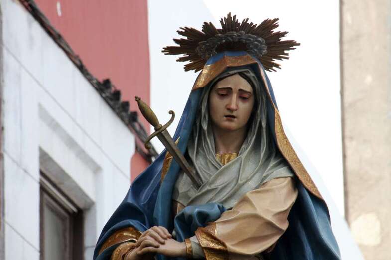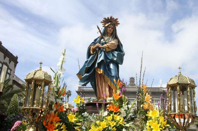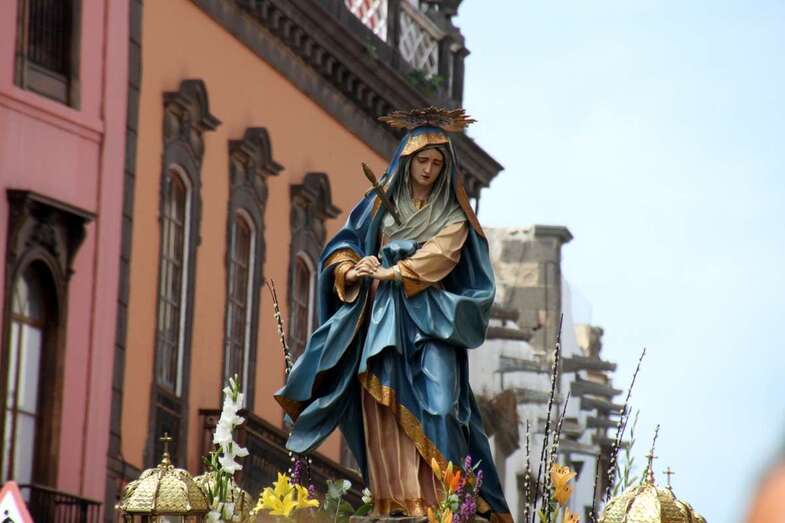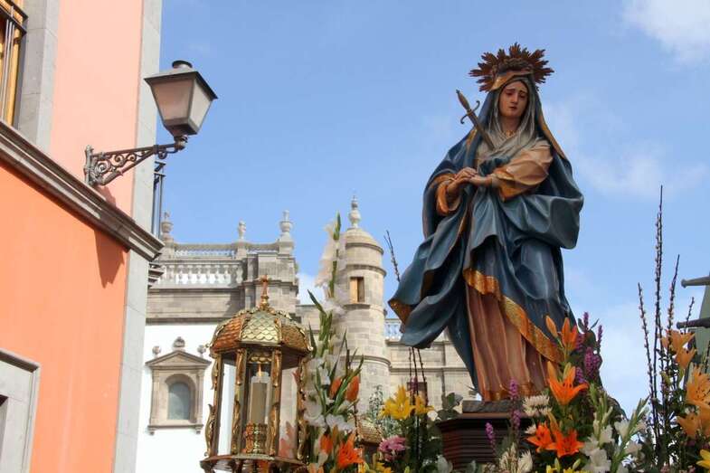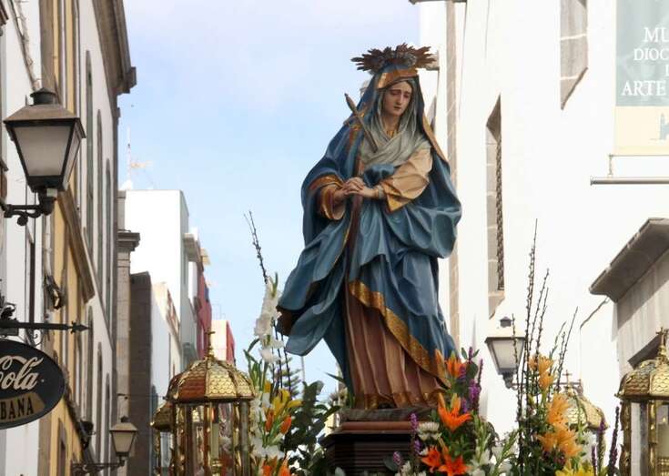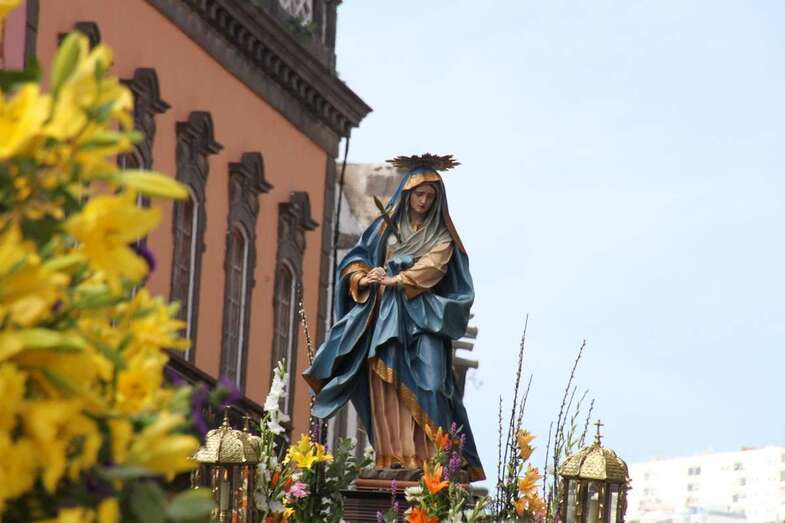 Dentro del programa procesional dedicado a la Semana Santa de Las Palmas de Gran Canaria y especialmente la del emblemático barrio de Vegueta, la de la mañana del  Viernes Santo 14 de abril de 2017, la conocida como Procesión de Las Mantillas, una de las más emotivas, que convoca a un numeroso público fiel en su devoción a las dos imágenes  que procesionan, por el colorido, tradición y recogimiento, que muestran las mujeres y niñas que, discretamente, bajo las mantillas blancas canarias, rosario en sus manos, abren la comitiva religiosa que se inicia a las puertas del atrio de la Catedral Basílica de Canarias.
