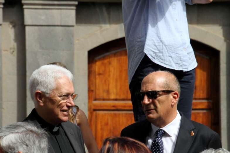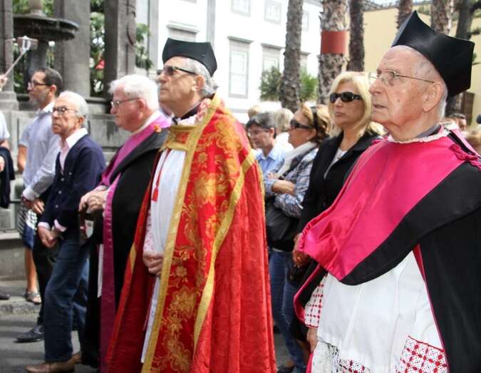 Descendiendo los tronos hasta el tramo de Obispo Codina y ante el pórtico de la Catedral, antes de entrar en el templo, el Obispo de la Diócesis de Canarias, Monseñor Francisco Cases Andreu, imparte palabras de reflexión, oración, gratitud y devoción desde el balcón del Palacio Episcopal, ante las dos imágenes sacras, El Cristo de la Sala Capitular y la Virgen Dolorosa, con un público expectante respondiendo a la oración conjunta al pie de los tronos, entre las blancas y relucientes mantillas vestidas por mujeres y niñas, después de acompañar en la procesión las dos imágenes veneradas.