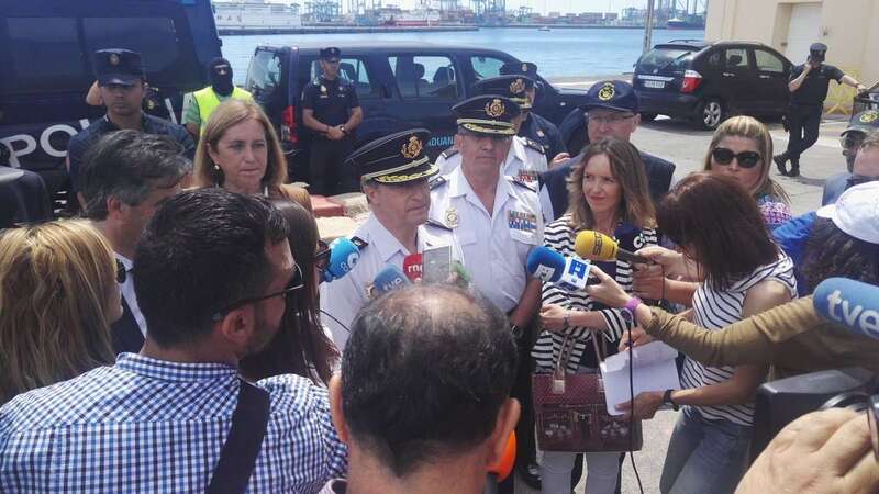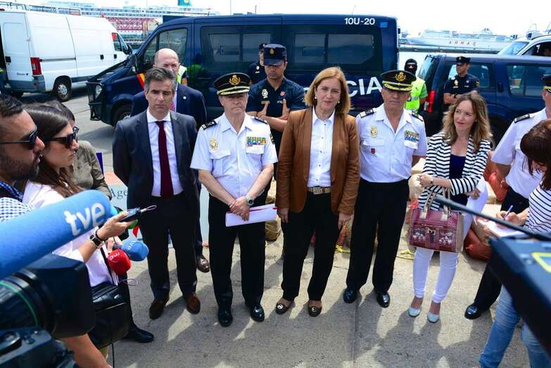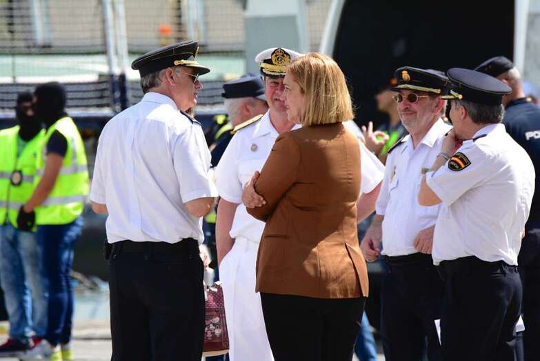 La delegada del Gobierno en Canarias, Mercedes Roldós; el director adjunto operativo de la Policía Nacional, Florentino Villabona Madera; el Jefe Superior de Policía de Canarias, José María Moreno; y la delegada especial de la Agencia Tributaria en Canarias, Carmen Guillén Prieto; estuvieron presentes en la llegada del barco.
