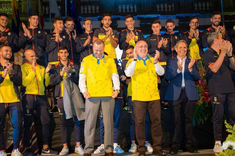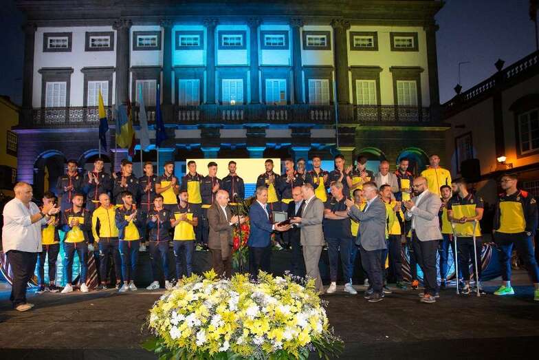 El equipo, emocionado ante la imponente postal que les ofrecía el escenario, recibió una placa conmemorativa de manos del presidente del Cabildo de Gran Canaria, Antonio Morales, y el alcalde de la capital, Augusto Hidalgo, quienes a su vez fueron obsequiados con una camiseta del filial amarillo firmada por sus jugadores.