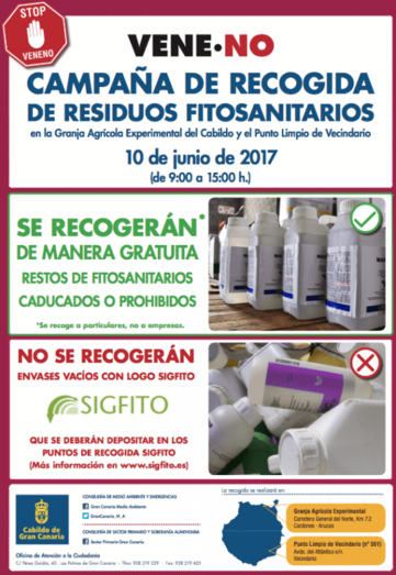 Las Palmas de Gran Canaria.- El Cabildo de Gran Canaria recogerá de manera gratuita venenos y productos fitosanitarios prohibidos en el ambito rural, una medida preventiva que se pone en marcha por primera vez y cuyo objetivo es erradicar el uso de estas sustancias antes de proseguir con las inspecciones rutinarias.