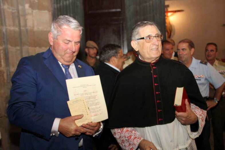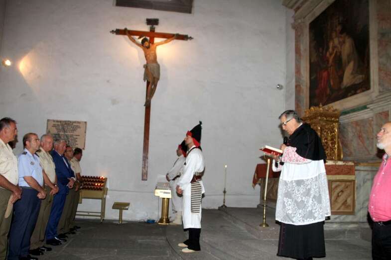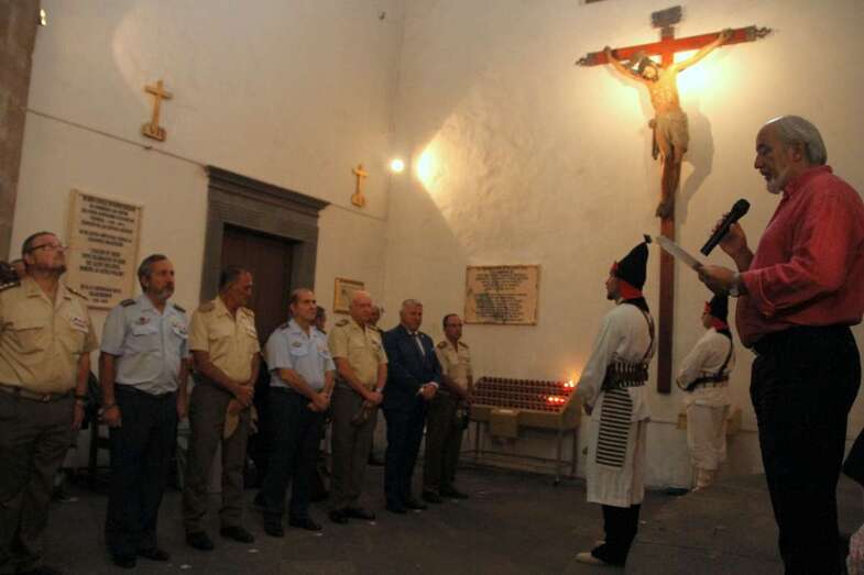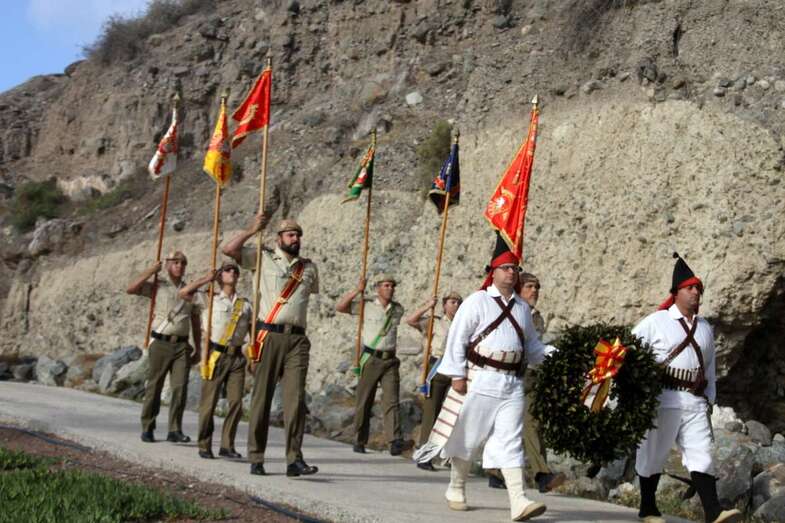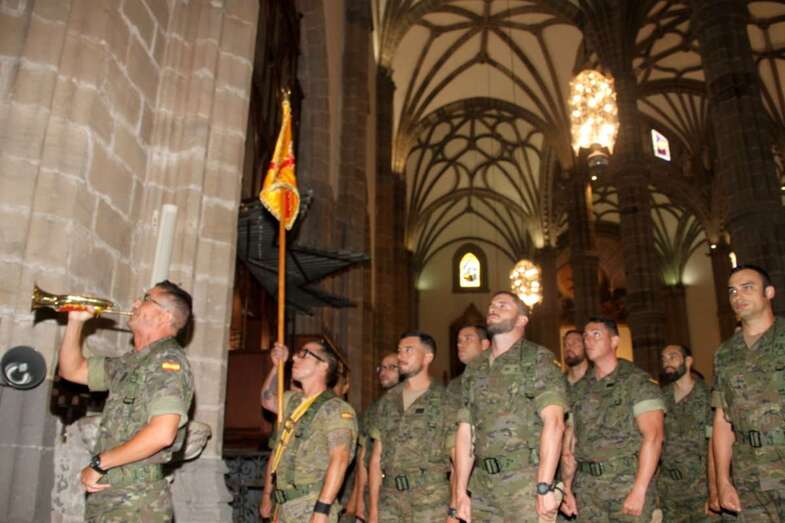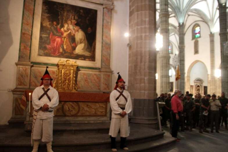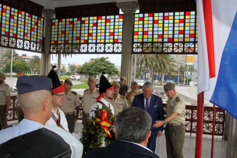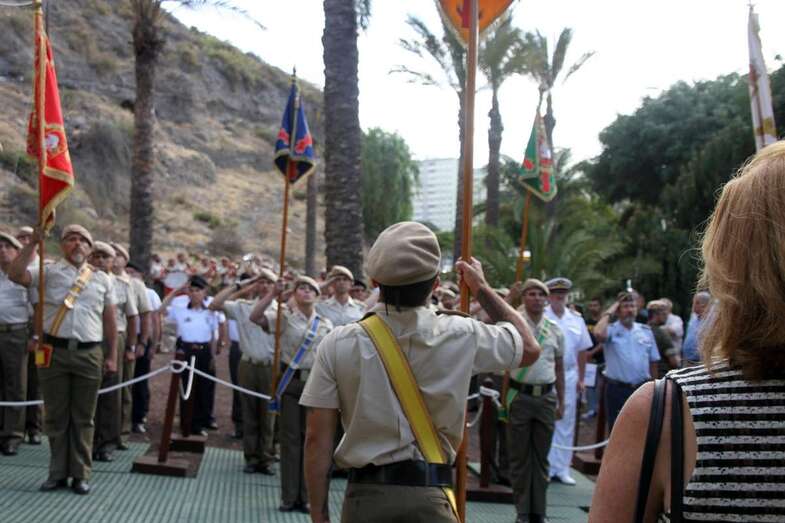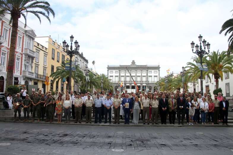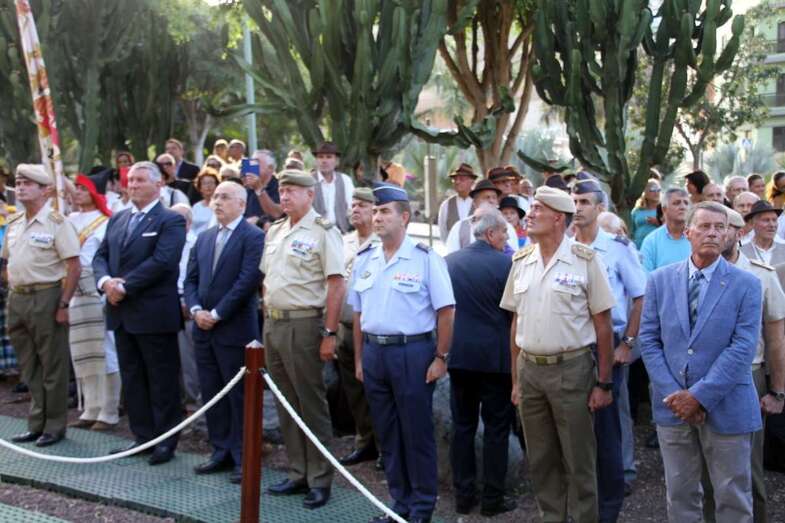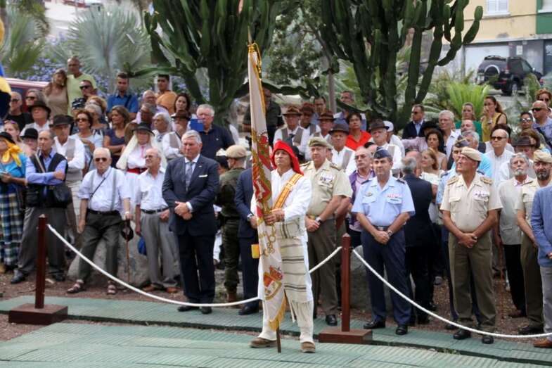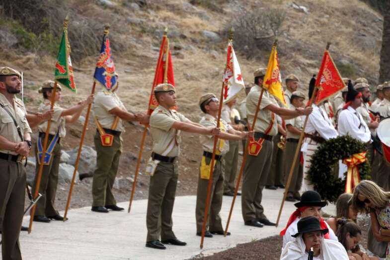 El emotivo momento de los Honores a los Caídos, en Homenaje a los soldados de todos los tiempos encuadrados en los Ejércitos que un día lucharon con valor, sirvieron con lealtad y murieron con honor, dando su vida por España. Acto de profundo sentimiento vivido por los asistentes que en silencio escucharon las palabras dedicadas a los que dieron su vida por Gran Canaria, por la Fe y la Unidad de España, Guiones y Banderines de la Unidad Militar situadas ante el Monumento, en la ofrenda de una corona de laurel portada por dos soldados con traje de miliciano. Interpretado por la Banda Militar de Música, del emocionante himno al Soldado Caído de, La muerte no es el final, con el Toque de Oración, disparos de fusilería (salvas), y otras marchas militares que despiden el acto ante el Monumento a Alonso Alvarado con la retirada de la Unidad Militar al Castillo de Casa Mata.
