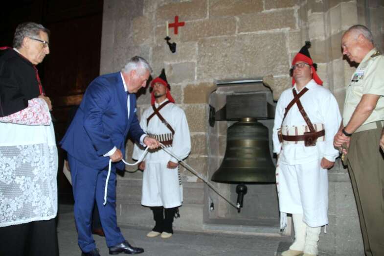 El lunes 3 de julio, a las 09:00 hs, en la Santa Catedral Basílica de Canarias, en presencia de las autoridades civiles, militares, el Deán de la Catedral, D. Nicolás Monche López, en la Capilla de Santa Catalina, lee el responso ofrecido por los héroes ante la tumba del canónigo Bartolomé Cairasco de Figueroa, con una ofrenda floral y toque de oración por el cornetín de órdenes del Regimiento Canarias-50 “el del Batán”, lugar donde “simbólicamente están enterrados todos aquellos que murieron por la defensa de la isla, por la fe y España”. El Cónsul Honorario de Holanda, Excmo. Sr. don Stan Weytjens, en la campana ubicada a la entrada, lateral izquierdo de la Catedral, da los 14 toques que recuerdan los 14 días que los holandeses permanecieron en la isla en 1599. Campana conmemorativa donación de los holandeses como reza la leyenda sobre la placa informativa: “IV Centenario. La Asociación Neerlandesa de esta isla donó esta campana votiva en memoria de las que retiró de sus torres el Vice-Almirante Pieter Van der Does durante la invasión holandesa a Gran Canaria. 1599 Las Palmas de Gran Canaria 1999”. El Cónsul, don Stan Weytjens, recibe del Deán, D. Nicolás Monche, el documento que certifica dicho acto, así como la cuerda con que manejó el badajo de la campana para hacer sonar los 14 toques. Ya en el exterior y frente a la Plaza de Santa Ana se procedió a la foto de familia de todos los participantes en estos actos conmemorativos.