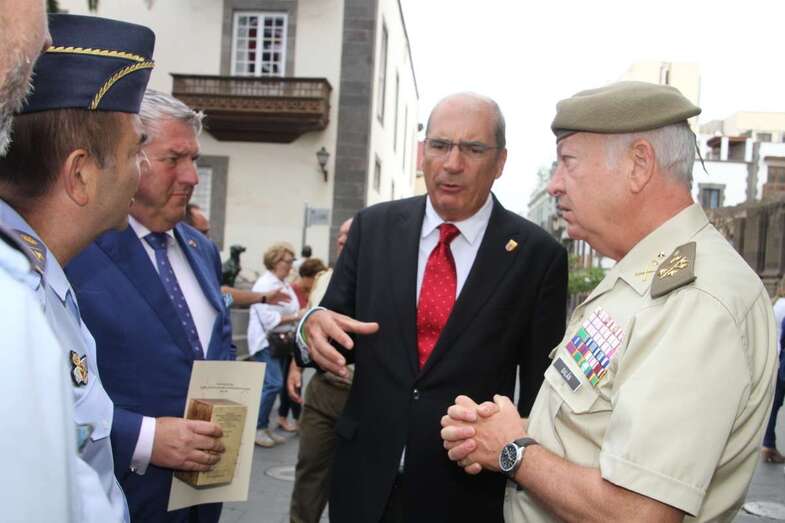 A continuación se entregó de manos del Teniente General Pedro Galán García una edición de su “Lección Histórica” impartida por este motivo conmemorativo el 2016, con el título “La Batalla de Las Palmas en el gozne de dos siglos: o de cómo los canarios arrancaron una gloriosa victoria de las fauces de la derrota”. Interesante documento que narra las vicisitudes del enfrentamiento y ataque del holandés detallados en sus apartados: Contexto Histórico en que se sucedieron los hechos de armas. Valor Estratégico de Gran Canaria y Las Palmas. Estado de Defensa. Intenciones de la Flota Holandesa. La Batalla. Trascendencia Histórica del Ataque. Incluye dos fragmentos gráficos en blanco y negro imágenes de la representación de la batalla y ataque del Almirante holandés Peter van der Does, frente a la Bahía de las Isletas. Esta edición fue firmada y dedicada a requerimiento del numeroso público por su autor, el Excmo. Sr. D. Pedro Galán García, Teniente General Jefe del Mando de Canarias.