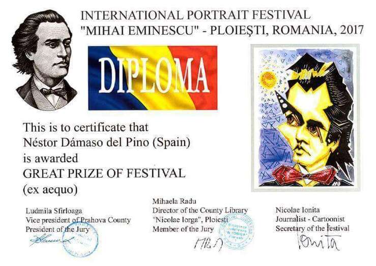 Enhorabuena a Néstor Dámaso del Pino por esta especialidad de la caricatura, compleja y muy detallada en su estilo propio de representación del personaje, y por los merecidos galardones recibidos fruto de una profunda vocación artística y del magnífico trabajo conseguido, y a la representación social del tejido cultural de Rumanía por el enorme interés de acercar nuestras culturas ofreciendo a la ciudadanía un motivo más de orgullo y agradecimiento, y perseverar en el reconocimiento del trabajo y buen hacer de personalidades que representaron y representan el progreso y avance cultural desde ambos espacios geográficos y humanos, España  y Rumanía. Muchas gracias.