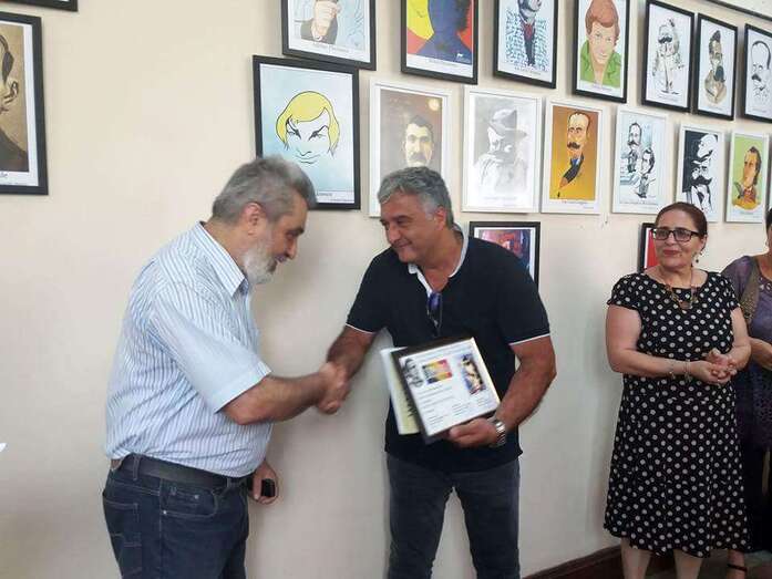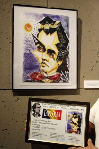 Selección expositiva de láminas con personajes internacionales rumanas en la Sala de Exposiciones de la Biblioteca Nicolae Iorga, de la ciudad de Ploiesti. Destacando entre otras, la caricatura premiada del poeta Mihai Eminescu. Exposiciones que tendrán el carácter de itinerantes por todo el país y por los Institutos Culturales y Consulados de Rumanía en España. Aquí, el artista canario ha recibido personalmente el premio, en presencia de personalidades culturales.