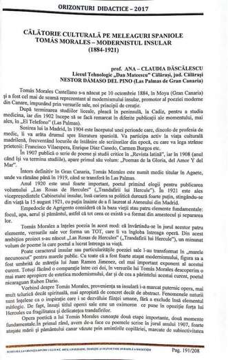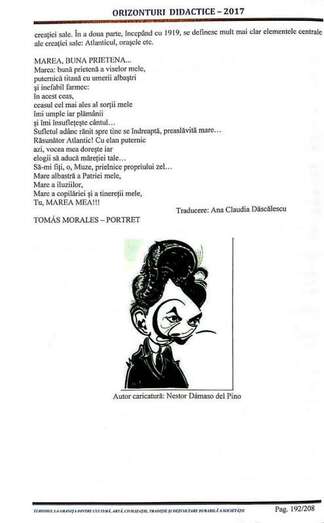 Durante los actos celebrados en el trascurso de este Festival Internacional de la Caricatura, y con la estancia del galardonado canario caricaturista en Rumanía, la filóloga Ana Claudia Dascalescu, presentó un texto en rumano con la biografía de Tomás Morales culminada con el poema dedicado al mar en los versos de la Oda al Atlántico, de Las Rosas de Hércules, y la caricatura del poeta de Moya.