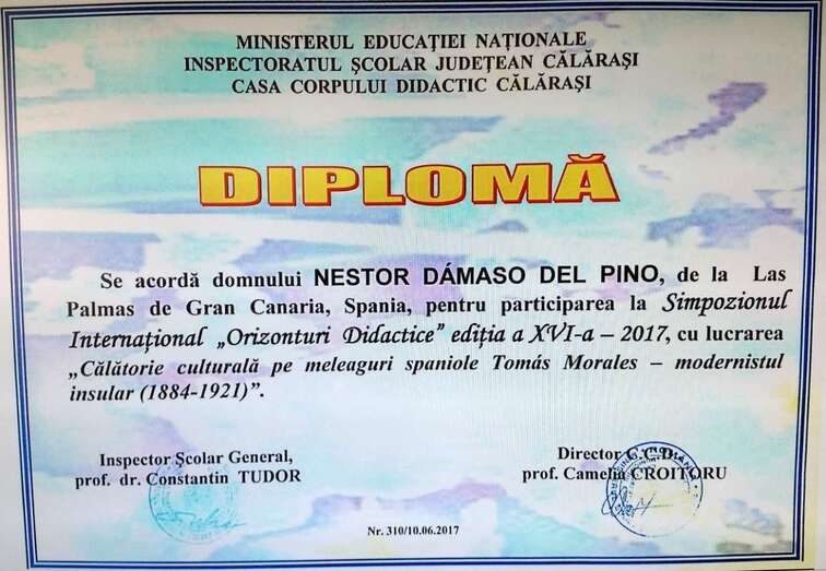 Mi agradecimiento a la filóloga Ana Claudia Dascalescu, por la excelente disposición en la información e imágenes cedidas desde Rumanía, y el interés de conocer y divulgar la obra literaria de nuestros escritores como Tomás Morales, Domingo Rivero y otros, y al propio artista Dámaso del Pino, en la magnífica representación ante la sociedad rumana de nuestra cultura, cuya presentación artística y exposición de caricaturas está en proceso de realizarse con el apoyo del recientemente inaugurado Consulado de Rumanía para las Islas Canarias, en la ciudad de Telde, y del enorme interés puesto en este proyecto cultural de la Honorable Cónsul en Canarias, Sra. Alina Elena Ramaru, en la voluntad de acercar las culturas canaria y rumana de gran trascendencia para dar a conocer la gran obra literaria, artística, social, histórica y humana, que llenó de gloria nuestro acervo cultural, y viceversa, atraer a nuestros focos culturales la intelectualidad rumana de la que con sus dibujos Néstor Dámaso ha dado conocer parte de sus grandes intelectuales siendo portavoz de los nuestros en Rumanía.