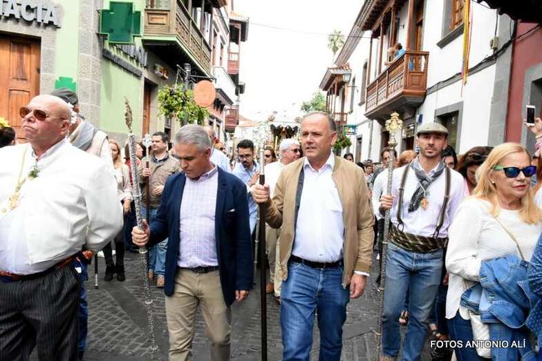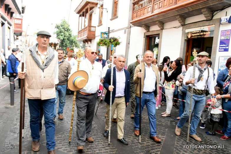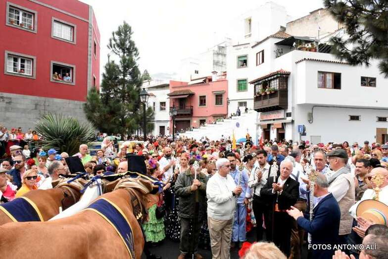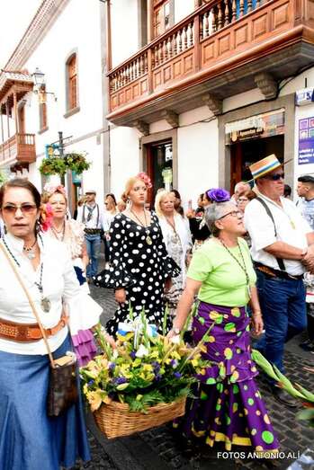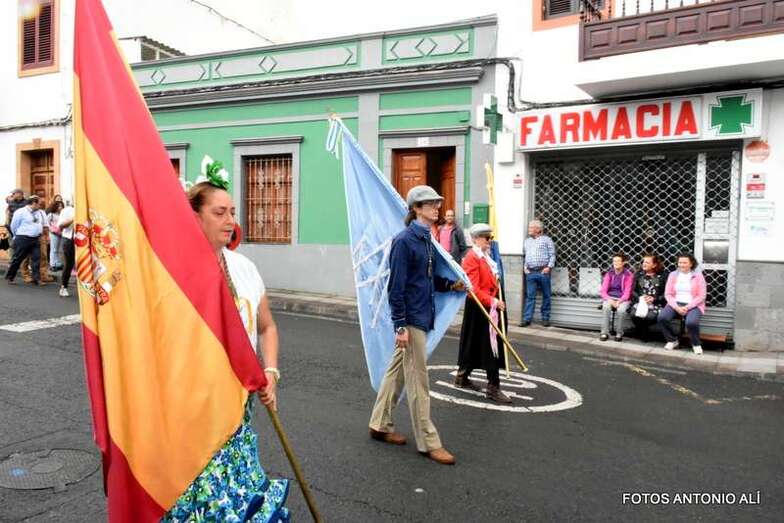 Al filo de las 12.30 horas tuvo lugar el encuentro en el Puente del Pino y media hora se ofició en la Basílica de Teror la misa rociera interpretada por el Coro de la Real Hermandad. Luego se llevaría a cabo a la ofrenda floral a la patrona de la Isla.