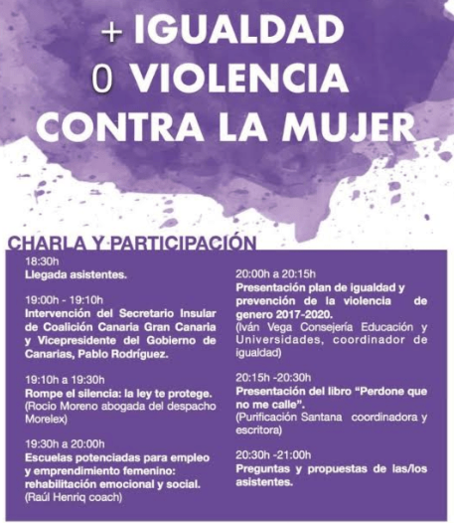Por su parte, el coordinador de Igualdad de la Consejería de Educación y Universidades del Gobierno de Canarias, Iván Vega, presentará el Plan de Igualdad y Prevención de la Violencia de Género 2017-2020. La jornada concluirá con la presentación del libro Perdone que no me calle por parte de Purificación Santana, coordinadora de la obra y una de las 62 autoras que han colaborado en su elaboración.