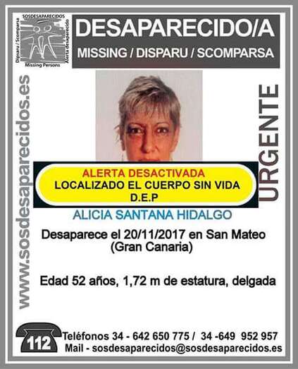 Las primeras informaciones apuntan a que se trataría de Alicia Santana Hidalgo. Una mujer de 52 años de edad a la que se buscaba desde ayer lunes, tras desaparecer. De hecho, desde la Asociación Española de Difusión y Alertas de Personas Desaparecidas SOS han confirmado la localización del cadáver de esta vecina de San Mateo.