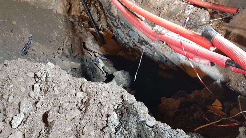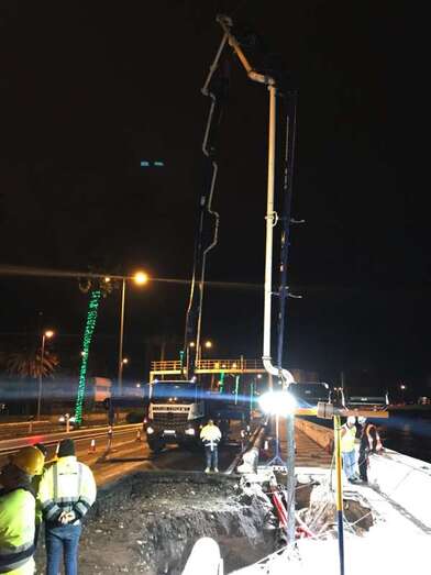 Para demoler, rellenar el socavón y reforzar el soporte del carril derecho y el paseo marítimo han sido necesarios emplear 110 metros cúbicos de hormigón con 18 cubas, una bomba de hormigonado, un retroexcavadora y una grúa pluma para bajar el material.