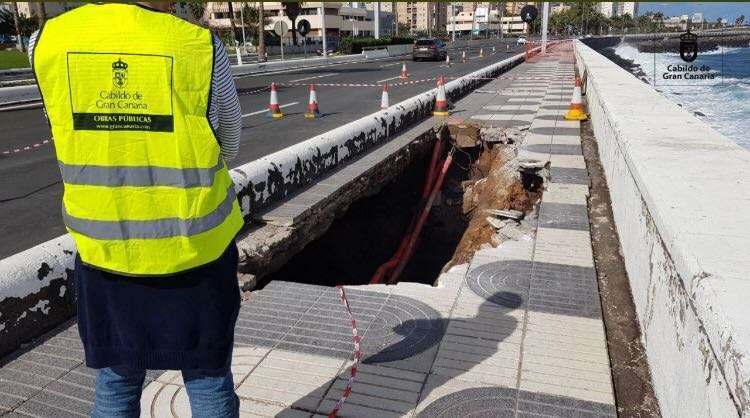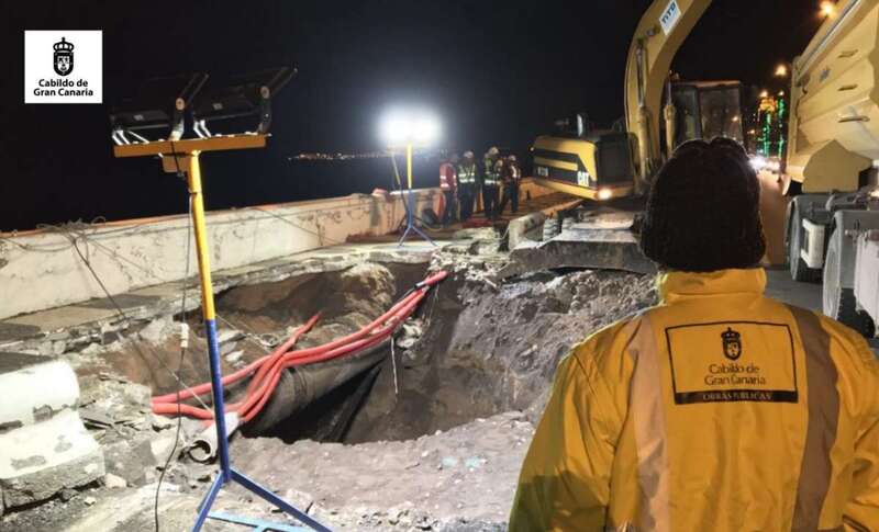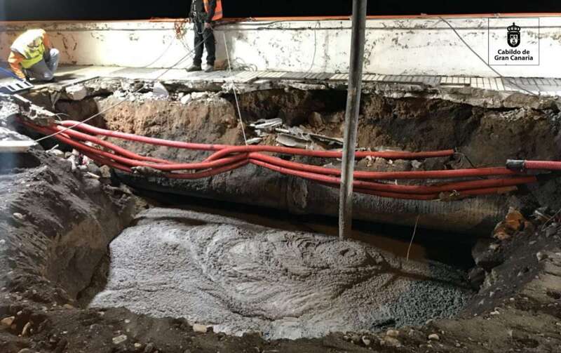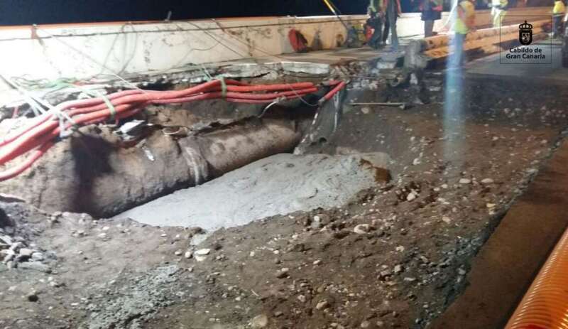 Personal de la Consejería de Obras Públicas del Cabildo de Gran Canaria y la empresa especializada en trabajo vertical Top Canarias completaron las obras en tiempo récord. Unos trabajos de gran complicación, en ocasiones bajo tierra o descolgándose por la escollera, para tapar el orificio y evitar que el hormigón que se vertía en el socavón se fuera hacia el mar, con el condicionante de la inminente subida de la marea.