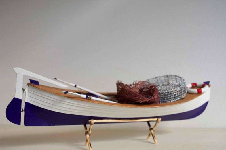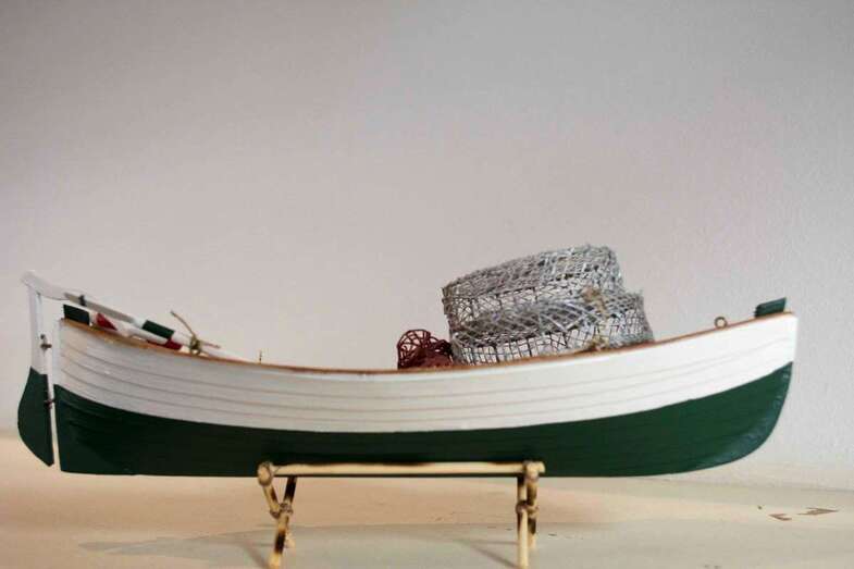 Es la tercera reproducción que hace el artista de esta embarcación que ha podido que recrear puntillosamente gracias a la visualización de fotos y que está confeccionada con cajas de fruta y materiales reciclados. Para elaborar la cubierta ha utilizado hasta 1.400 palos de madera.