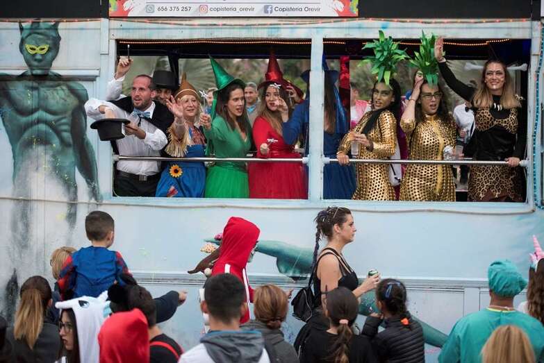 La música no ha cesado ni un solo minuto en toda la tarde, cayendo la noche en Las Palmas de Gran Canaria al ritmo de un sin fin de canciones y de bailes a los que se han ido sumando cada vez más mascaritas.