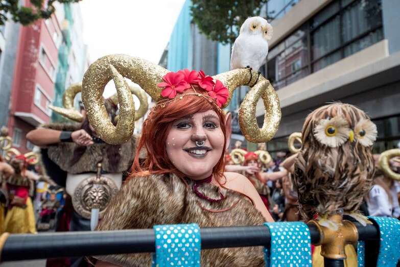 La magia y las criaturas fantásticas, alegoría de esta edición, han transformado el centro de Las Palmas de Gran Canaria en una fiesta en movimiento desde que han partido las carrozas y comitiva del barranco de Guiniguada para iniciar el desfile que concluirá en el puerto.