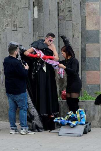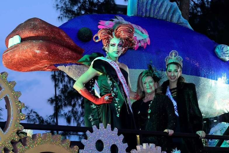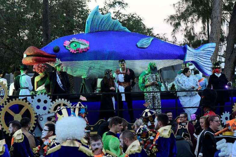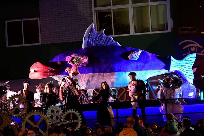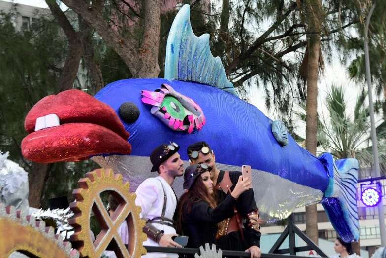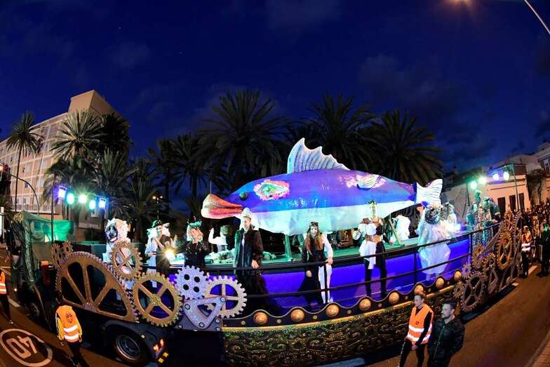 Drag La Tullida, la Reina Ana Suárez, la Gran Dama María Suárez, la concejala Inmaculada Medina, y grupos de figuración y bailarines acompañaron a la sardina sobre un carruaje decorado por Rubén Cabrera, Ninoska Monzón y Ana María del Pino, componentes de XhOXb, colectivo artístico que ha ideado y realizado el escenario de estética victoriana con detalles Steam punk, así como la carroza anunciadora, y que ha incorporado al transporte de la sardina elementos que se nutren de idéntica fuente de inspiración.
