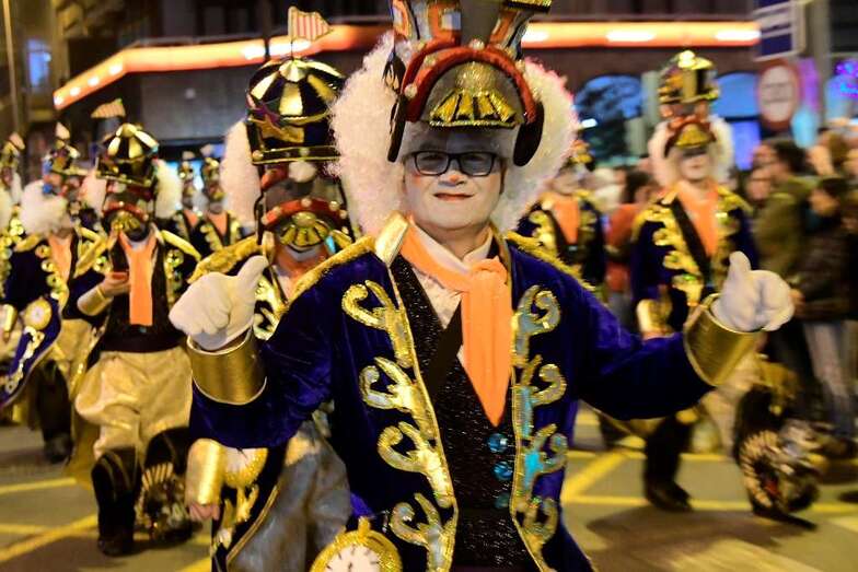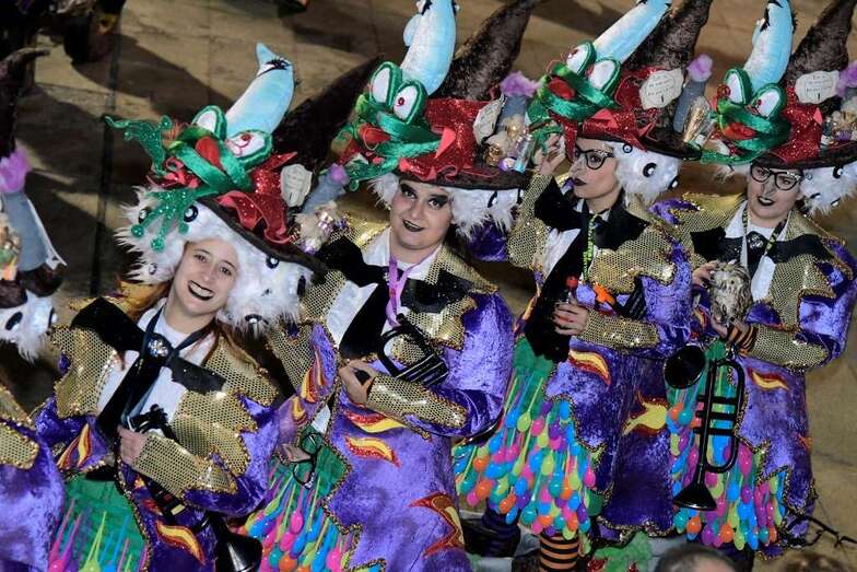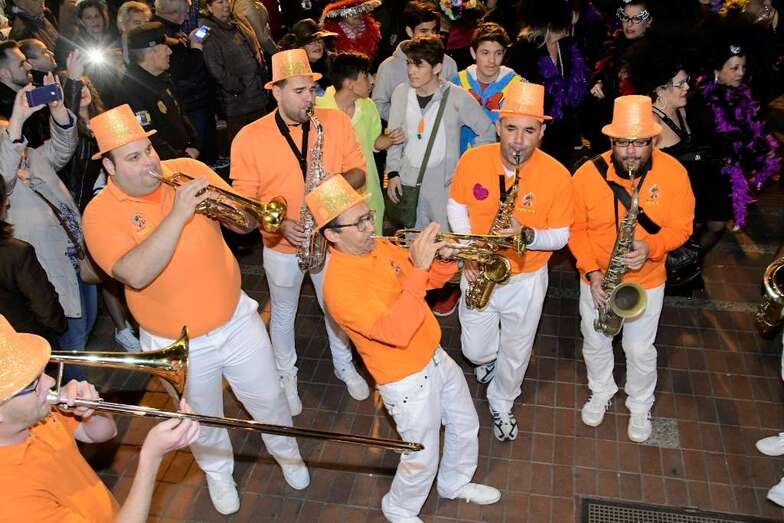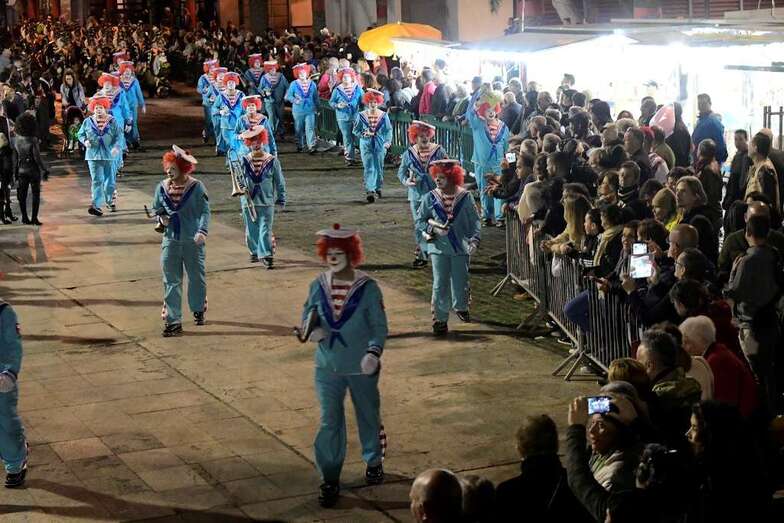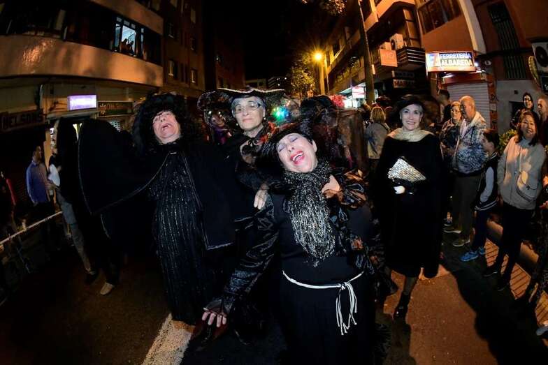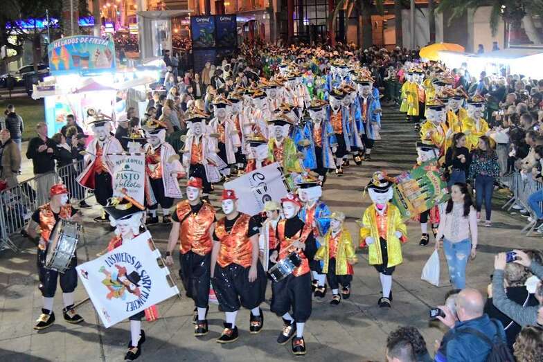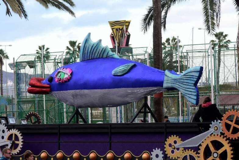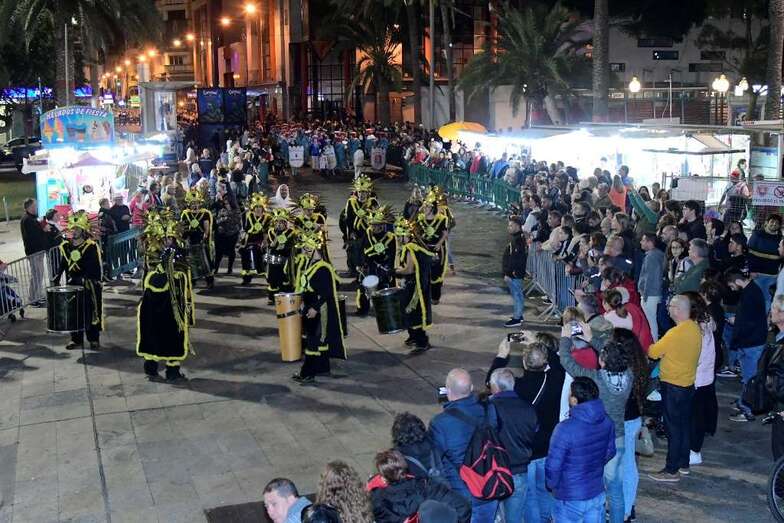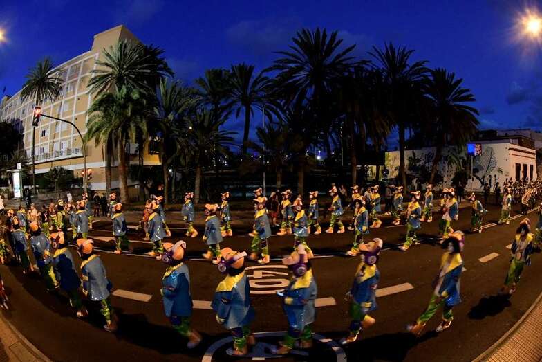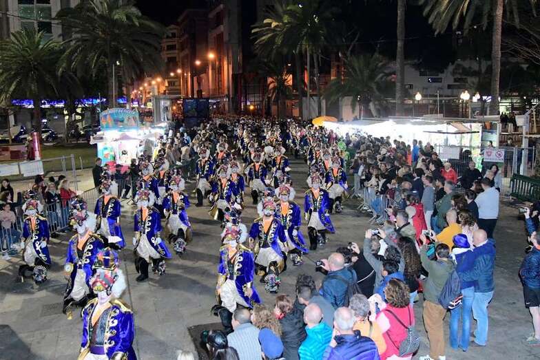 La batucada Samba Isleña, la afilarmónica Los nietos de Kika, los componentes de los grupos que lograron subir al podio del concurso de murgas: Serenquenquenes, Nietos de Sary Mánchez, Trapasones, en interpretación; y Despistadas y Twitty’s,en vestuario; y representantes de los grupos de disfraces, han abierto una comitiva que fue seguida por la carroza anunciadora –también ganadora del concurso de la Gran Cabalgata- y que contó con la espontaneidad de las plañideras y viudas que lloraban el deceso que se encontraba a la vista sobre esta plataforma que alcanzó los doce metros y medio de largo, sin contar la cabeza tractora, y que llegó a los cuatro metros y medio de alto, a la altura de la aleta dorsal de la sardina, un pescado de El Corte Inglés que medía 6,10 metros de largo.
