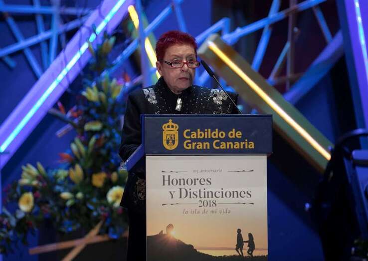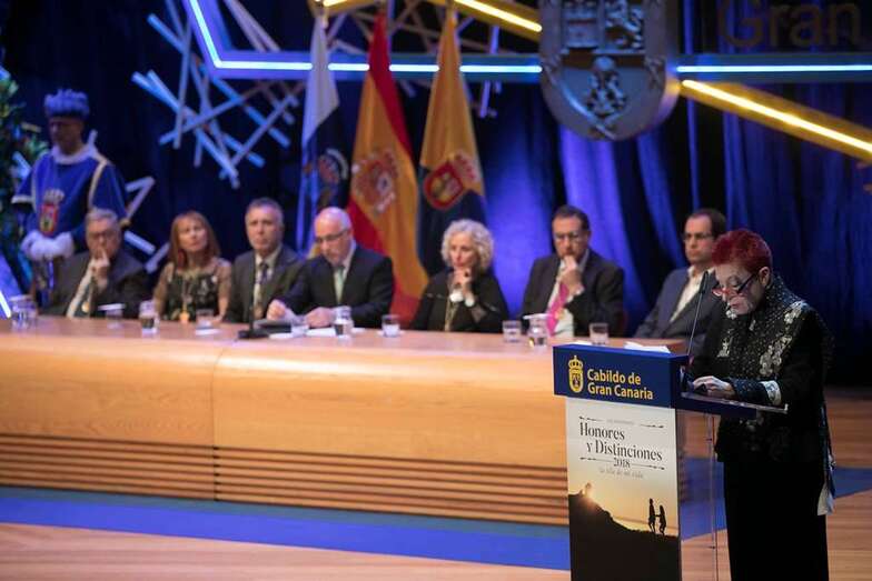 En nombre de las personas y entidades premiadas por el Cabildo, la artista Concha Jerez -Hija Predilecta- ha recordado a "las personas que huyen de sus lugares de origen, por el hambre, las guerras y diversos genocidios, alejándose de sus seres más queridos, y que en la búsqueda de paraísos imaginados que creen ver en las imágenes de las televisiones, concluyen su utopía en lo más profundo del mar Mediterráneo y de otros océanos".