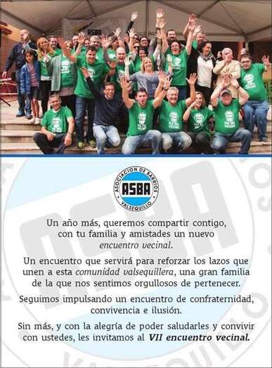 Con este acto se pretende contribuir a una mejora en la convivencia diaria en el municipio, compartiendo un espacio de reencuentro para todos, independientemente de las siglas e ideas de cada cual. Por ello, desde la Agrupación de Electores Asociación de Barrios (ASBA) se realiza una invitación abierta a todos los vecinos, colectivos, asociaciones o comisiones a participar en este nuevo encuentro.