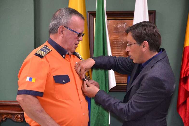 Telde.- El alcalde de Valsequillo, Francisco Atta y el concejal de Protección Civil, Víctor Navarro, entregaron días atrás la insignia de oro a José Martín, jefe de Servicio de la Protección Civil del municipio, en un acto celebrado en el salón de Plenos.