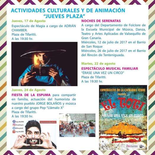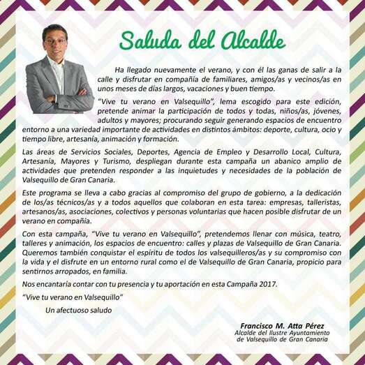 Valsequillo.- Bajo el lema Vive tu verano en Valsequillo, el Consistorio quiere conquistar un año más las calles y plazas del municipio con música, teatro y animación. La campaña estival vuelve para ofrecer un amplio programa de actividades para todos los públicos con el firme propósito de enriquecer las relaciones entre vecinos.