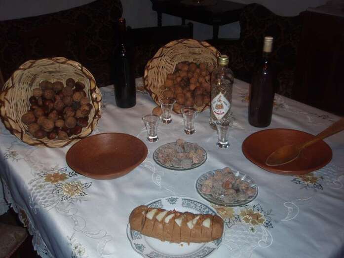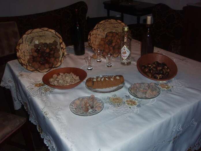 Los miembros de la asociación que preside María Teresa Cabrera Ortega, cronista oficial de Valsequillo de Gran Canaria, degustaron carne de cochino en adobo, pella pintada, castañas asadas, higos pasados y nueces, acompañando todo ello de vino dulce y el anís.