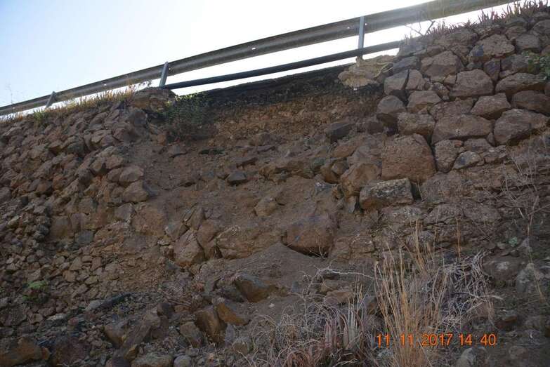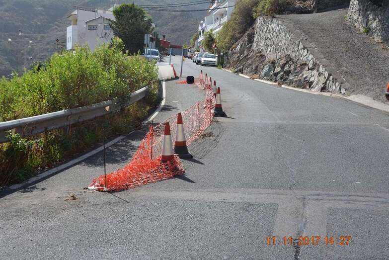 A simple vista, la GC-810 presenta dos tramos especialmente delicados. El primero de ellos se encuentra por debajo del restaurante Casa Brito. El interior de una de las curvas se encuentra delimitado con conos y mallas, para que los vehículos no la utilicen. “En esa zona, parte del firme se ha hundido levemente. Esto se puede apreciar perfectamente en el muro de contención del tramo, que se ha abombado, por lo que corre el riesgo de caerse”, explica el concejal de AV.