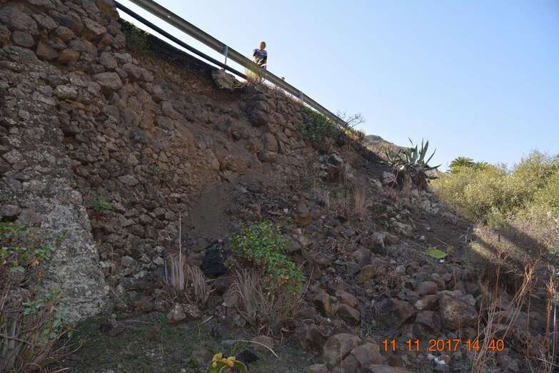 El segundo punto se ubica a la salida del barrio en dirección a la Higuera canaria. En esta zona, un tramo del muro de contención de la vía se ha caído, por lo que el Cabildo tomó la determinación de colocar una doble valla para impedir la circulación por el exterior de la vía.