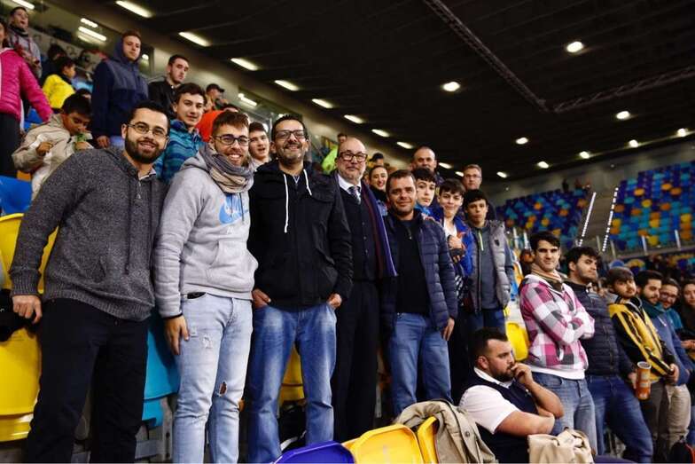 El presidente del C.B. Gran Canaria, Enrique Moreno, subió a la grada para saludar y sacarse una foto con toda la delegación de Valsequillo.