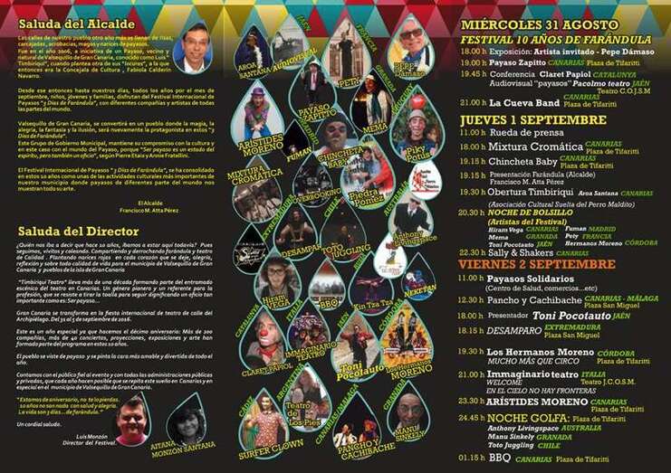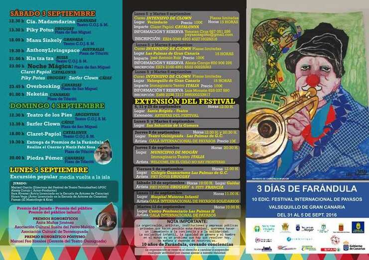 Valsequillo.- Las calles y plazas de Valsequillo volverán un año más, y ya van diez, a llenarse de sonrisas y alegría con el Festival Internacional de Payasos 3 Días de Farándula. Un evento que comenzará este miércoles, 31 de agosto, y que se extenderá hasta el lunes 5 de septiembre, aunque también contará actividades en diferentes puntos de la isla hasta mediados de mes.