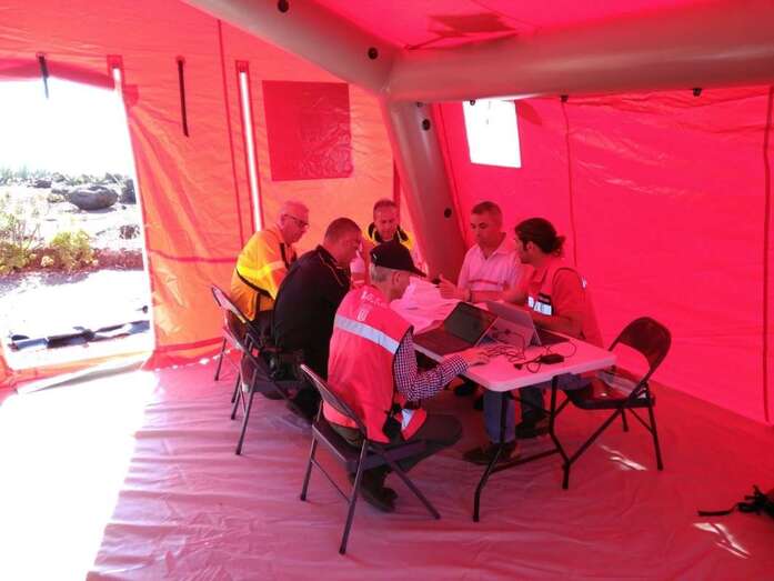 El ejercicio comenzó con una reunión de los responsables de la dirección de la emergencia y de la dirección de extinción y los coordinadores de logística, seguridad y sanidad que se celebró a las 10:00 en el Puesto de Mando Avanzado del Gobierno de Canarias, ubicado en Montaña Cabreja.