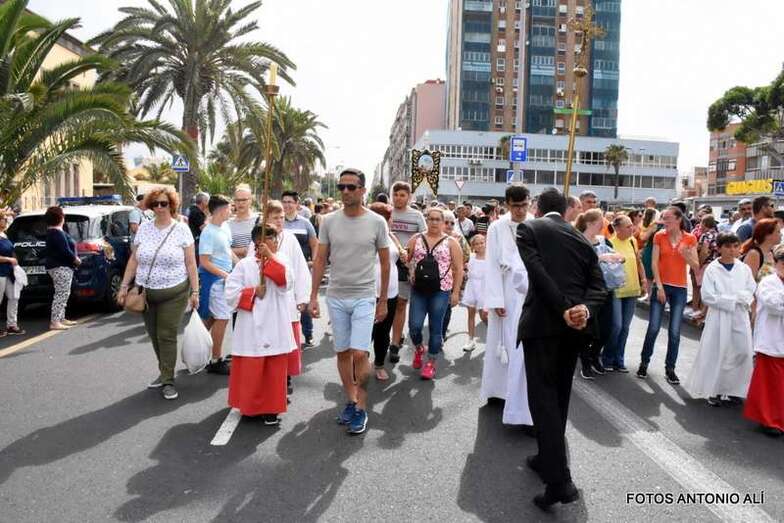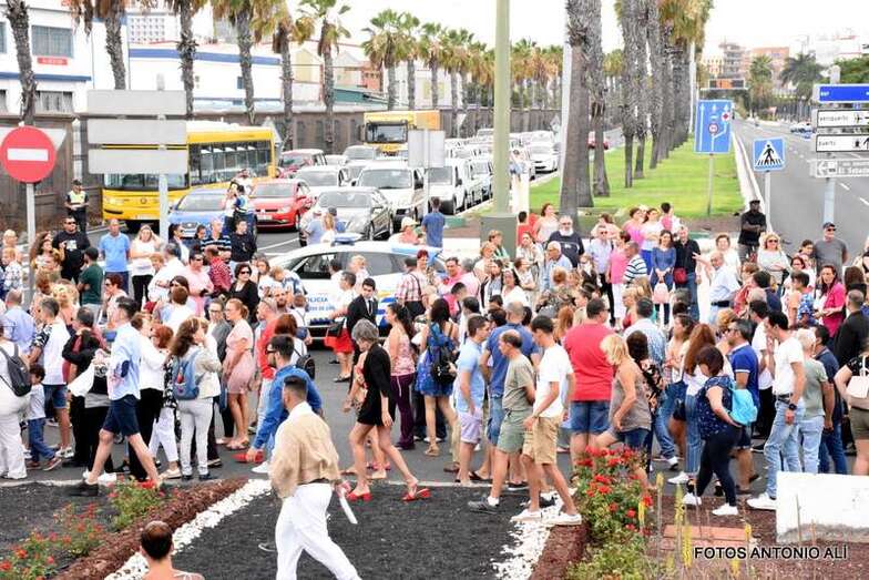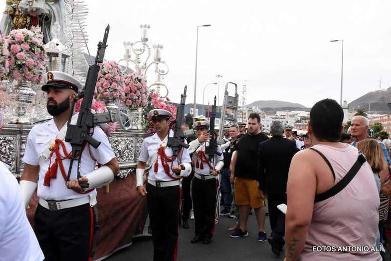 Tras alcanzar la calle de La Naval, la comitiva religiosa emprendió rumbo hacia Juan Rejón y el entorno de la rotonda de Belén María para dirigirse a la zona portuaria, con destino al muelle Primo de Rivera, donde la aguardaba el Rayo, el buque de Acción Marítima que la llevaría a surcar las aguas capitalinas.