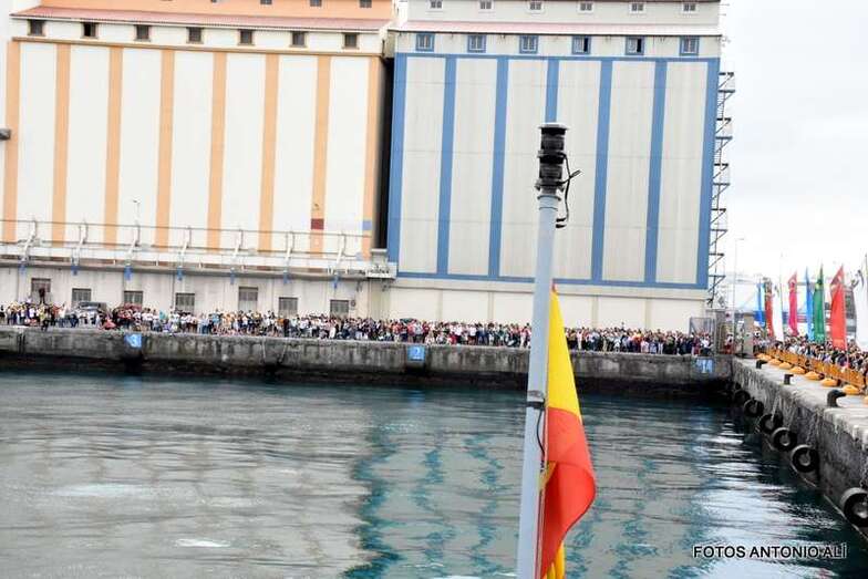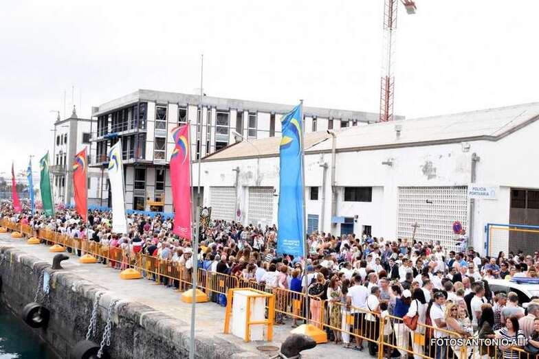 Ya en el buque de la Armada y acompañada por diferentes autoridades civiles y militares, la imagen de la patrona de los marineros comenzó su recorrido por la bahía de Las Palmas de Gran Canaria, custodiada por un nutrido grupo de embarcaciones de mediano y pequeño tamaña que no quisieron dejarla sola en su periplo marinero.