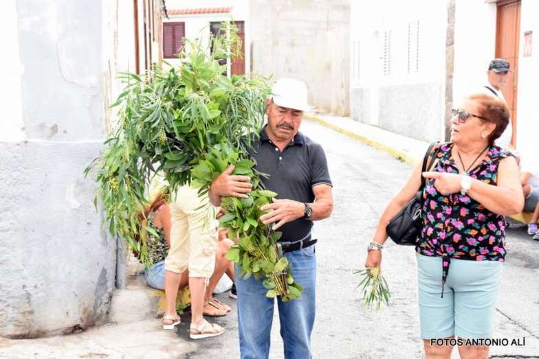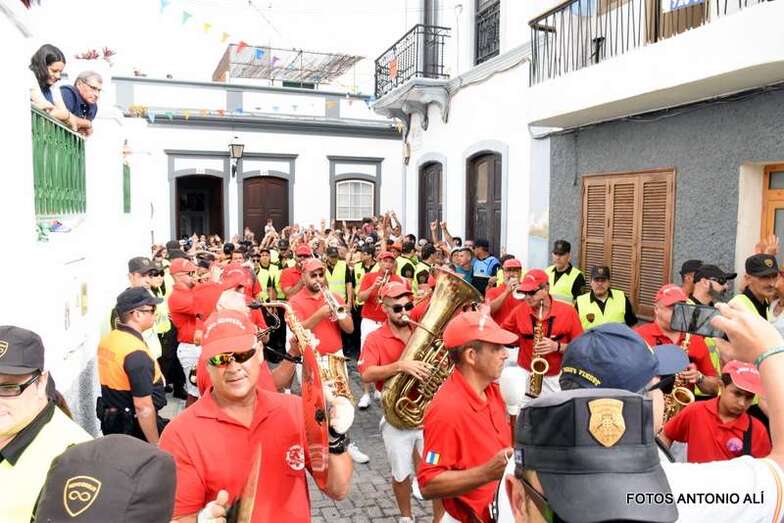 En los balcones muchos vecinos se sumaban al jolgorio que inundaba las calles mientras el ritmo no cesaba de retumbar por el casco de Agaete. Sobre las 12.00 horas la comitiva festiva enfilaba el cruce de las calles Concepción y Guayarmina dirigiéndose a la búsqueda de las ramas para el momento cumbre de la mañana.