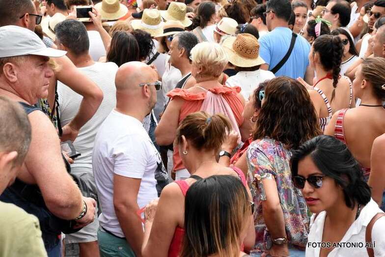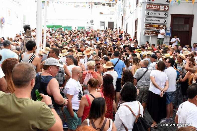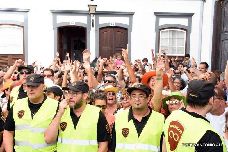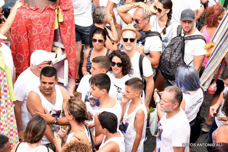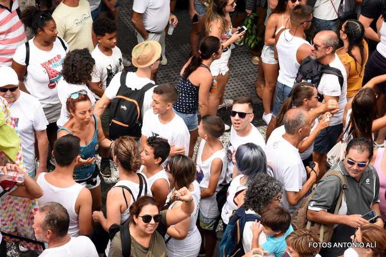 Mientras la temperatura iba subiendo, a pesar de estar el cielo ligeramente cubierto, la gente iba cogiendo posiciones a lo largo de la calle Guayarmina para vivir en primera mano la intensidad de la bajada de la Rama. Entre los participantes, además de los tradicionales sombreros de paja para amortiguar el calor, se sumaron en esta edición camisetas alusivas al rechazo a la construcción del macromuelle.