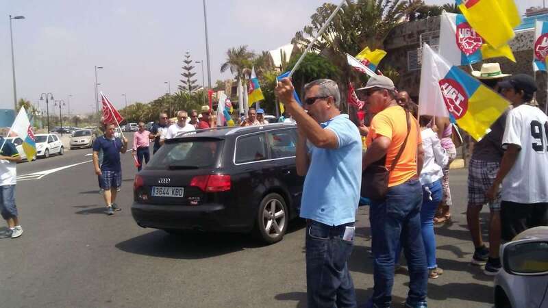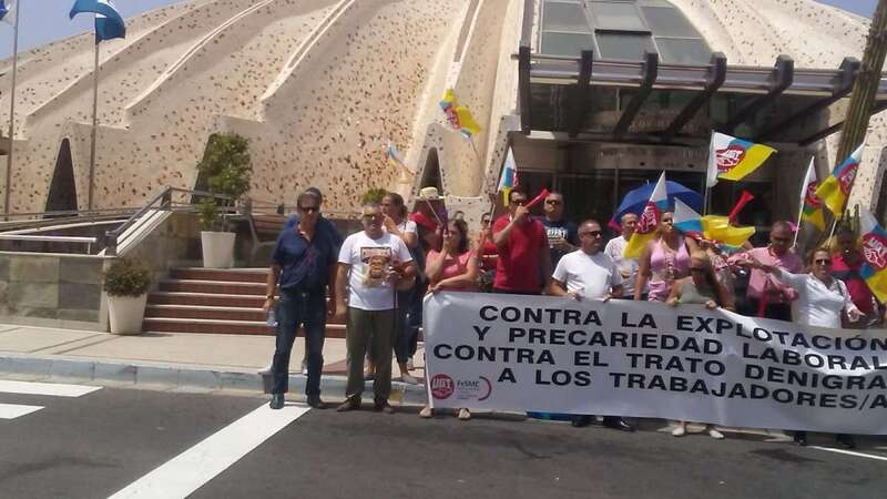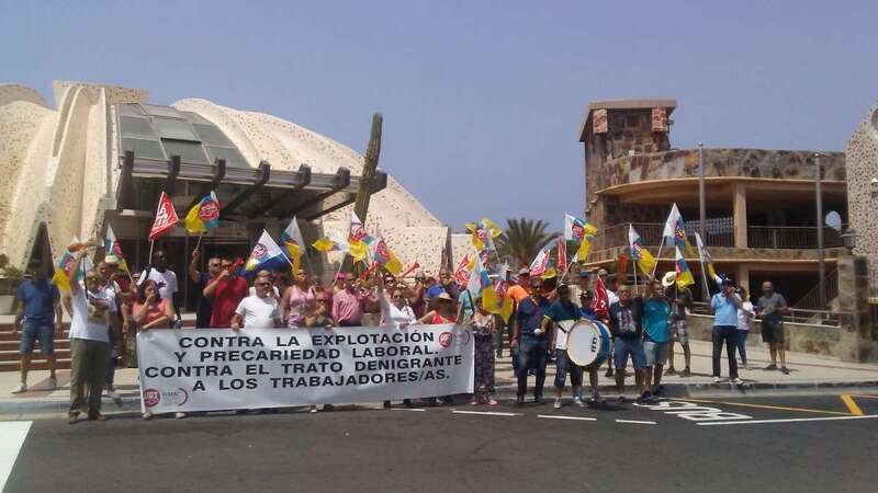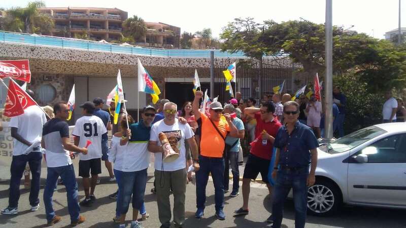 La protesta concentró a más de 20 personas ante las puertas del hotel ubicado en el sector de Meloneras del sur grancanario. Pitos, eslóganes contra la empresa y despliegue de banderas y pancartas marcaron la concentración sindical.