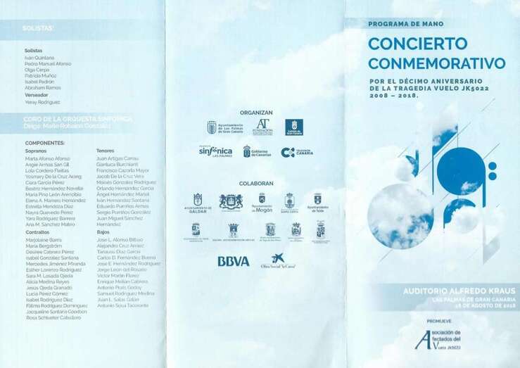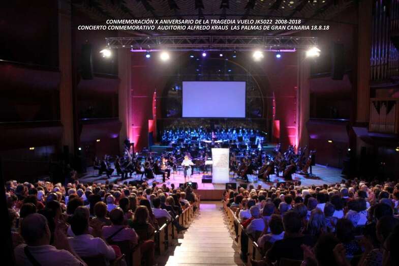 Este año 2018 la conmemoración del X Aniversario que promueve la Asociación de Afectados del Vuelo JK 5022, enmarcado en las mismas honras ante los monumentos que en diferentes localidades se celebran aunando el sentimiento y la ausencia de los seres queridos, en la noche del sábado 18 de agosto se celebró en el Auditorio Alfredo Kraus de Las Palmas de Gran Canaria, un memorable acto conmemorativo por el contenido del mensaje profundamente canario dedicado a los que a esta tierra, su isla, su Gran Canaria, el destino les arrebató la oportunidad de regresar y con el mensaje esencialmente musical volcado en su memoria hemos acercado con cada nota, voz, palabra y latir canario, que a todos los presentes nos ha llenado de sentimiento, esperanza y apoyo a los que con el dolor de la ausencia son merecedores del abrazo más profundo, sus familiares.