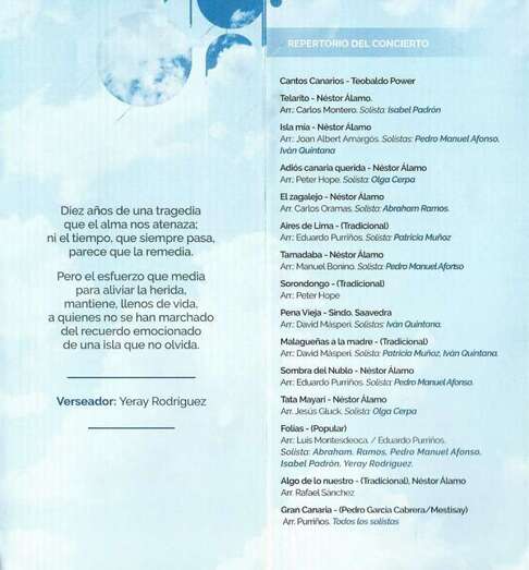 De los versos de Yeray Rodríguez: Diez años de una tragedia/ que el alma nos atenaza;/ ni el tiempo, que siempre pasa,/ parece que la remedia./ Pero el esfuerzo que media/ para aliviar la herida,/ mantiene, llenos de vida,/ a quienes no se han marchado/ del recuerdo emocionado/ de una isla que no olvida./