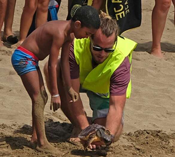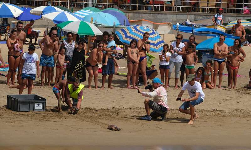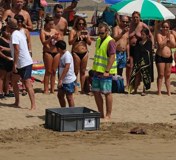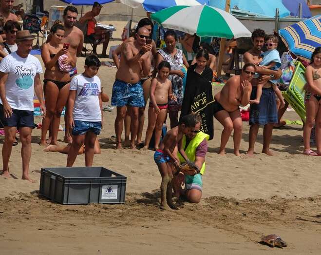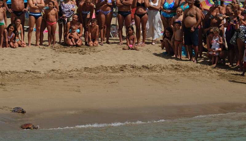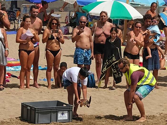 Posteriormente, en torno a las 14 horas, los organizadores y asistentes procedieron a bajar a la orilla de la playa para proceder a la suelta de dos tortugas, de nombre "Paz" y "Esperanza". Se pudo oir un gran aplauso del público cuando ambos animales consiguieron entrar en el agua volviendo así de nuevo a su hábitat natural.