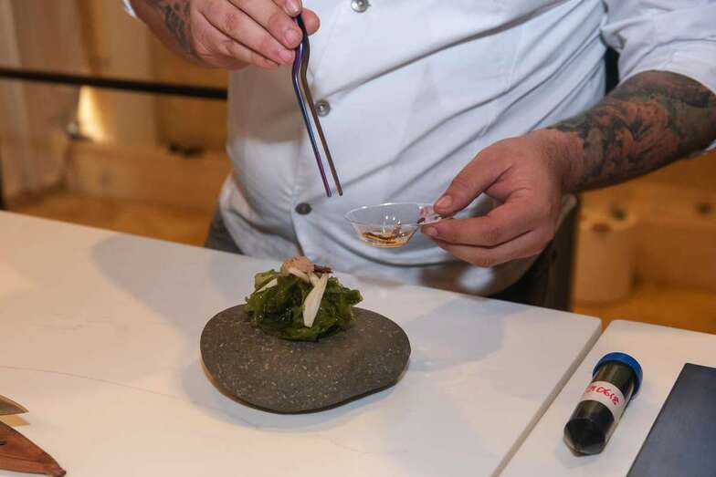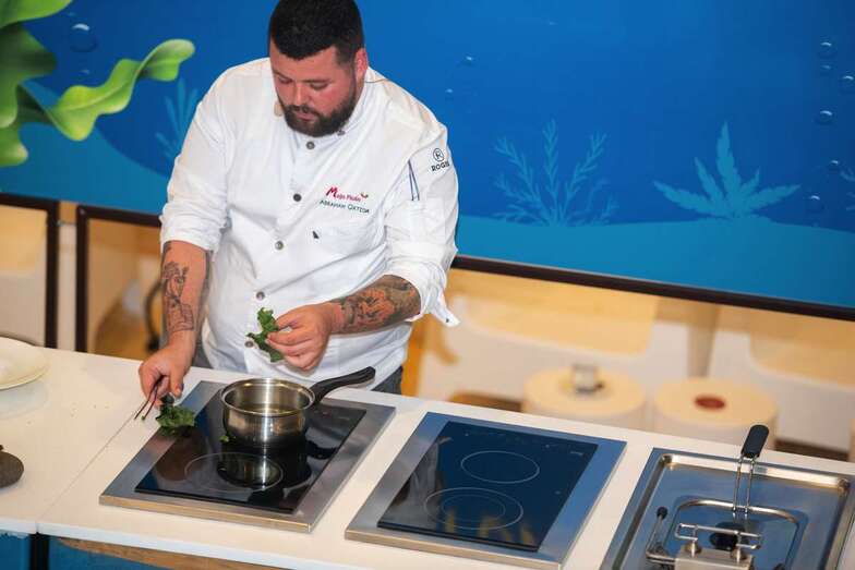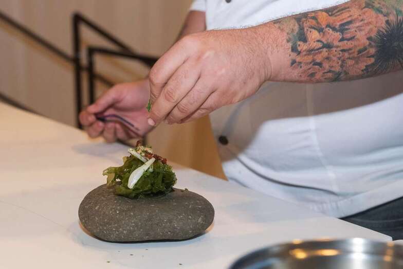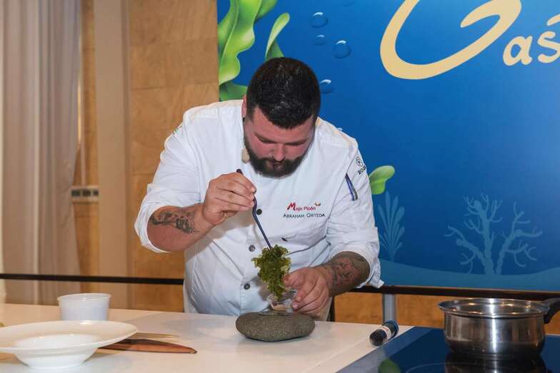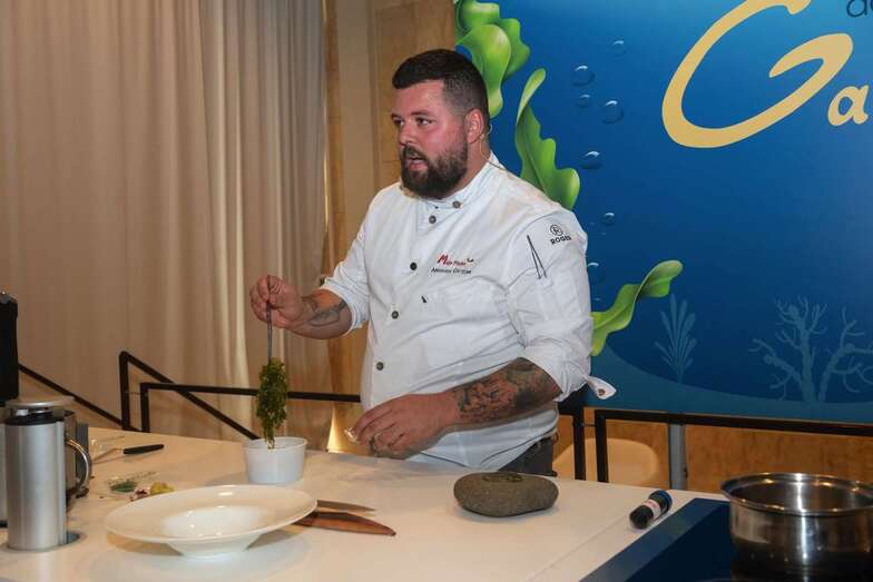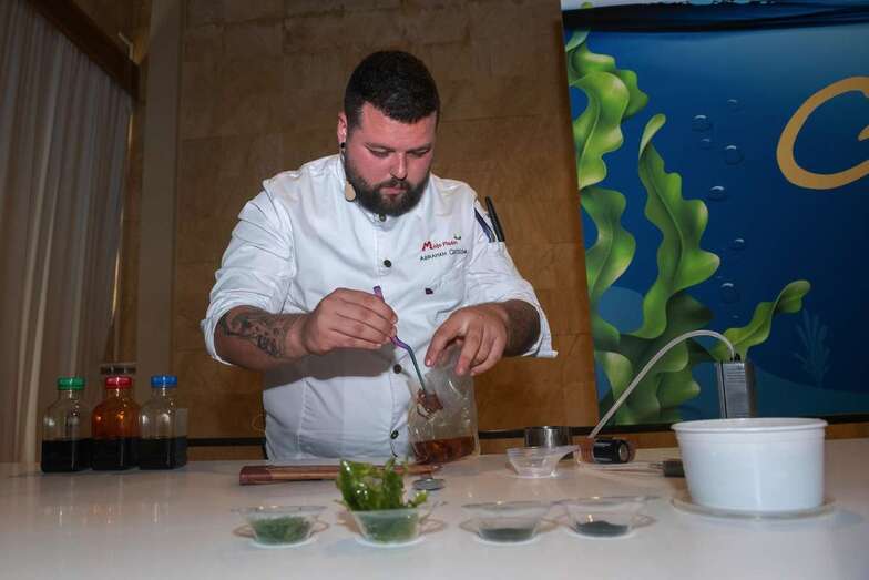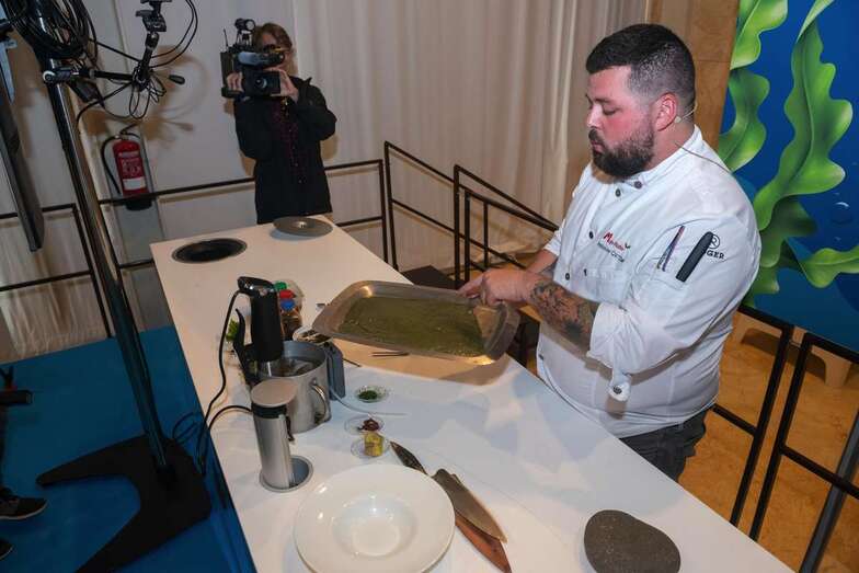 Fabián Maldonado ya cuenta en su restaurante El Cortijo con platos con algas y destacó su sabor yodado, que las microalgas como la espirulina, como el sorbete preparado para los participantes del encuentro, son en realidad súper alimentos, y que su textura ofrece tremendas posibilidades para realizar espumas, salsas o gelificaciones.